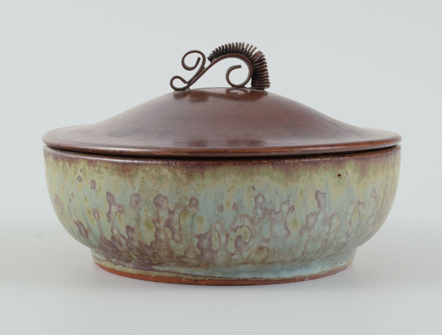 Arne Bang, Danmark. Art deco krukke i glaseret keramik med tilhørende bronzelåg. Smuk glasur i blågrønne nuancer. 1940'erne. Stemplet AB 183. I flot stand. Måler: 14,5 x H 8,5 cm.
