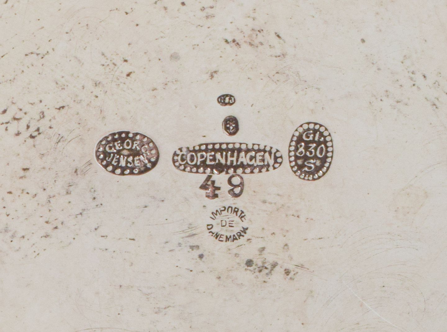 Sjælden Georg Jensen tekande i tretårnet sølv. Hank og lågknop af udskåret ibenholt. Med hængslet låg. Stemplet med 1915–1930 stempel. Dessin 49. Franske importstempler. I flot stand. Måler: H 20,0 cm.