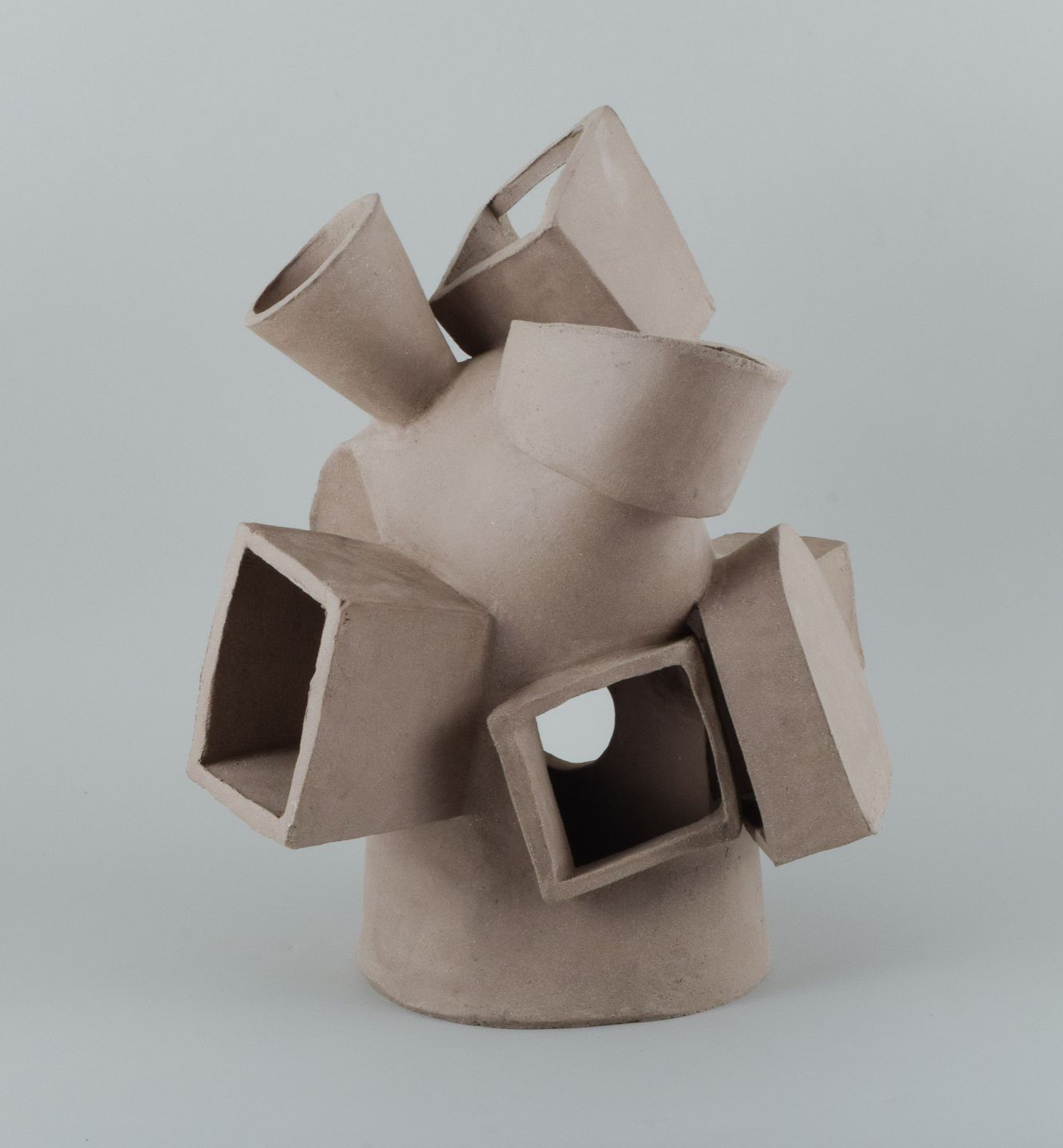 Unik monumental kubistisk skulptur i rå, uglasert ler.