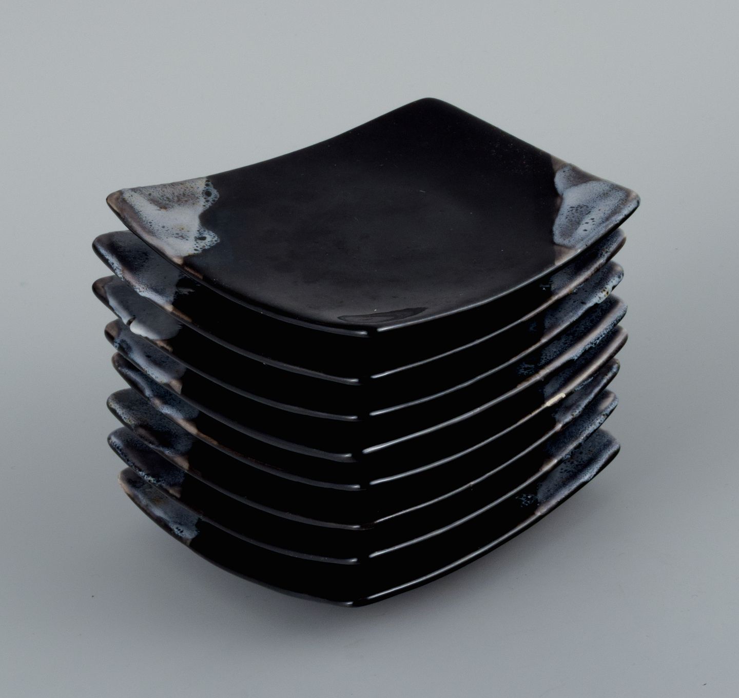 A modernistic four-person coffee service in ceramics consisting of four coffee cups with matching saucers, coffee pot, creamer, sugar bowl and three small plates.