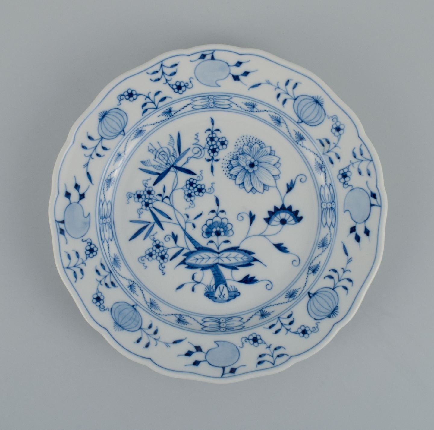 Meissen, et sæt på fire løgmønstret middagstallerkner. Ca. 1900. Første sortering. I perfekt stand. Stemplet. Mål: D 25,0 x H 3,5 cm.