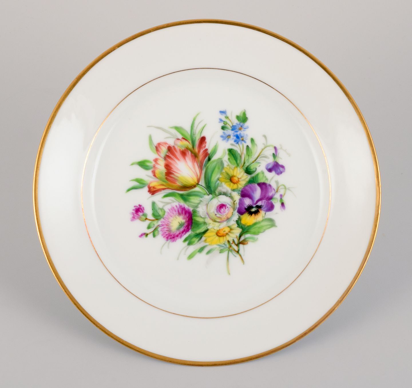 Bing & Grøndahl, seks frokosttallerkner i porcelæn håndmalet med polykrome blomster og gulddekoration. Ca. 1920/30’erne. I flot stand. Stemplet. Første sortering. Mål: D 20,0 cm.