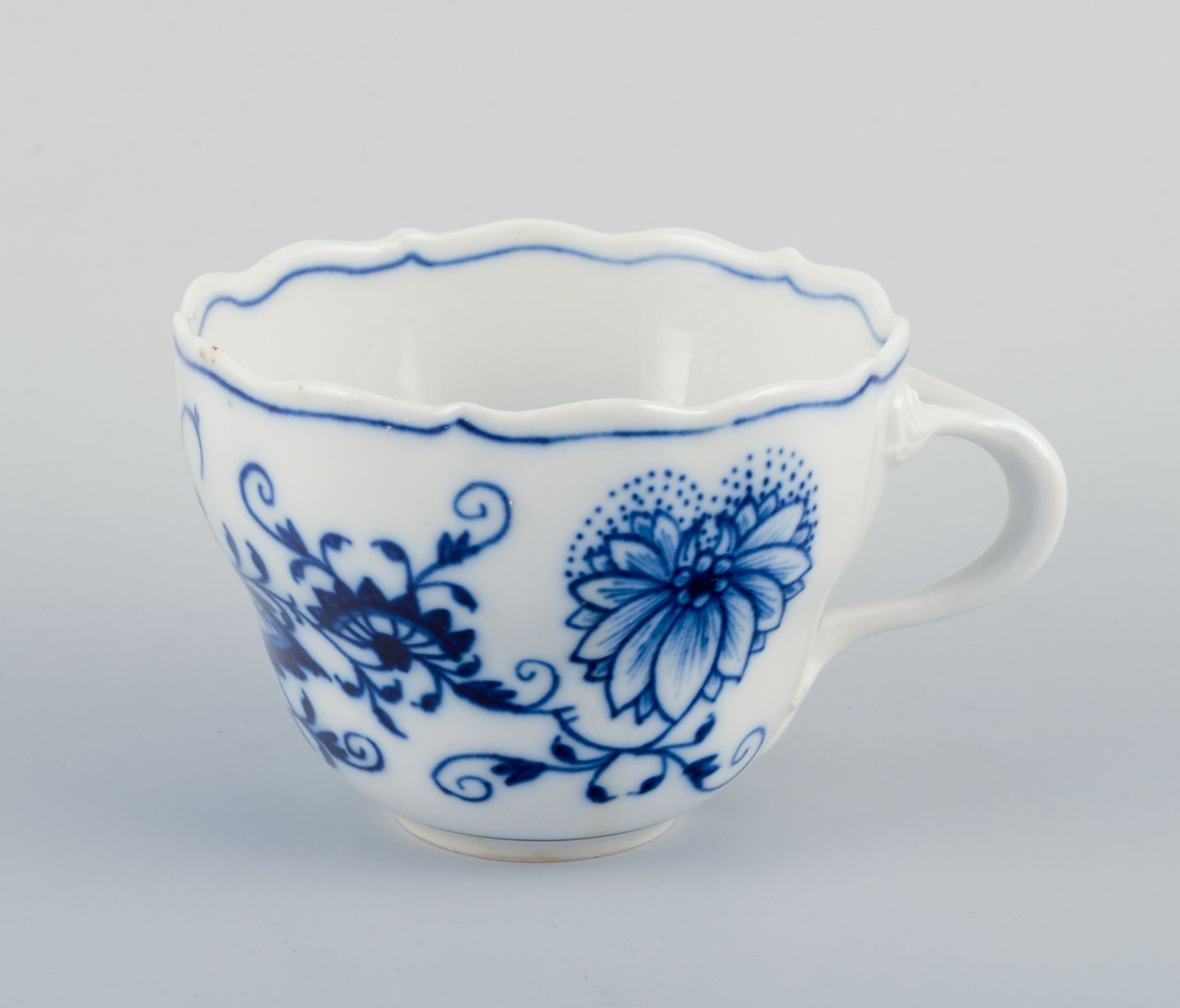 Meissen, Germany, four pairs of Blue Onion coffee cups with saucers. Hand-painted.