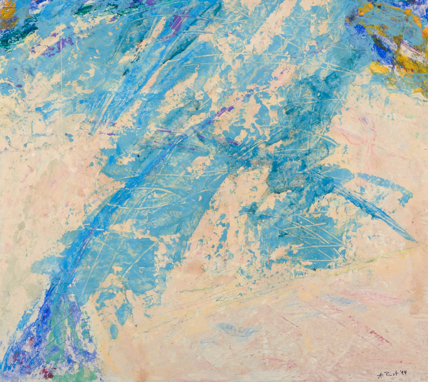 A. Rust, tysk kunstner. Akrymaling på træplade. Abstrakt komposition. Koloristisk palette. Signeret og dateret A. Rust ´94 Perfekt stand. Mål: 70 cm. x 100 cm.