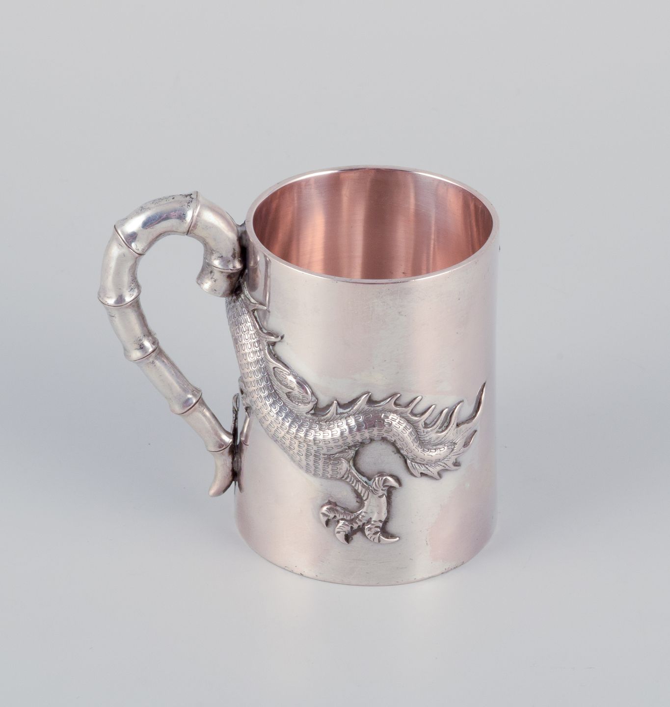 Luen-Wo, Shanghai. Sølvkop med hank. Dragemotiv i relief. Bambusimiteret hank.