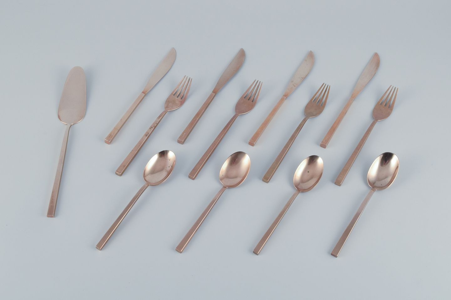 Bestående af fire frokostknive med skær, fire frokostgafler, fire dessertskeer, samt en smørrebrødsspade. 13 dele i alt.
