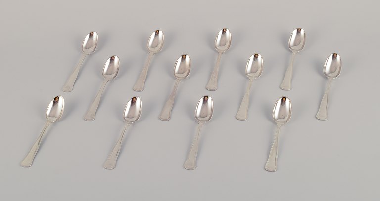 Cohr, dansk sølvsmed. Dobbeltriflet. Et sæt på tolv kaffeskeer i tretårnet sølv (830). Ca. 1940. Stemplet. I flot stand med almindeligt brugspræg. Mål: 11,9 cm.