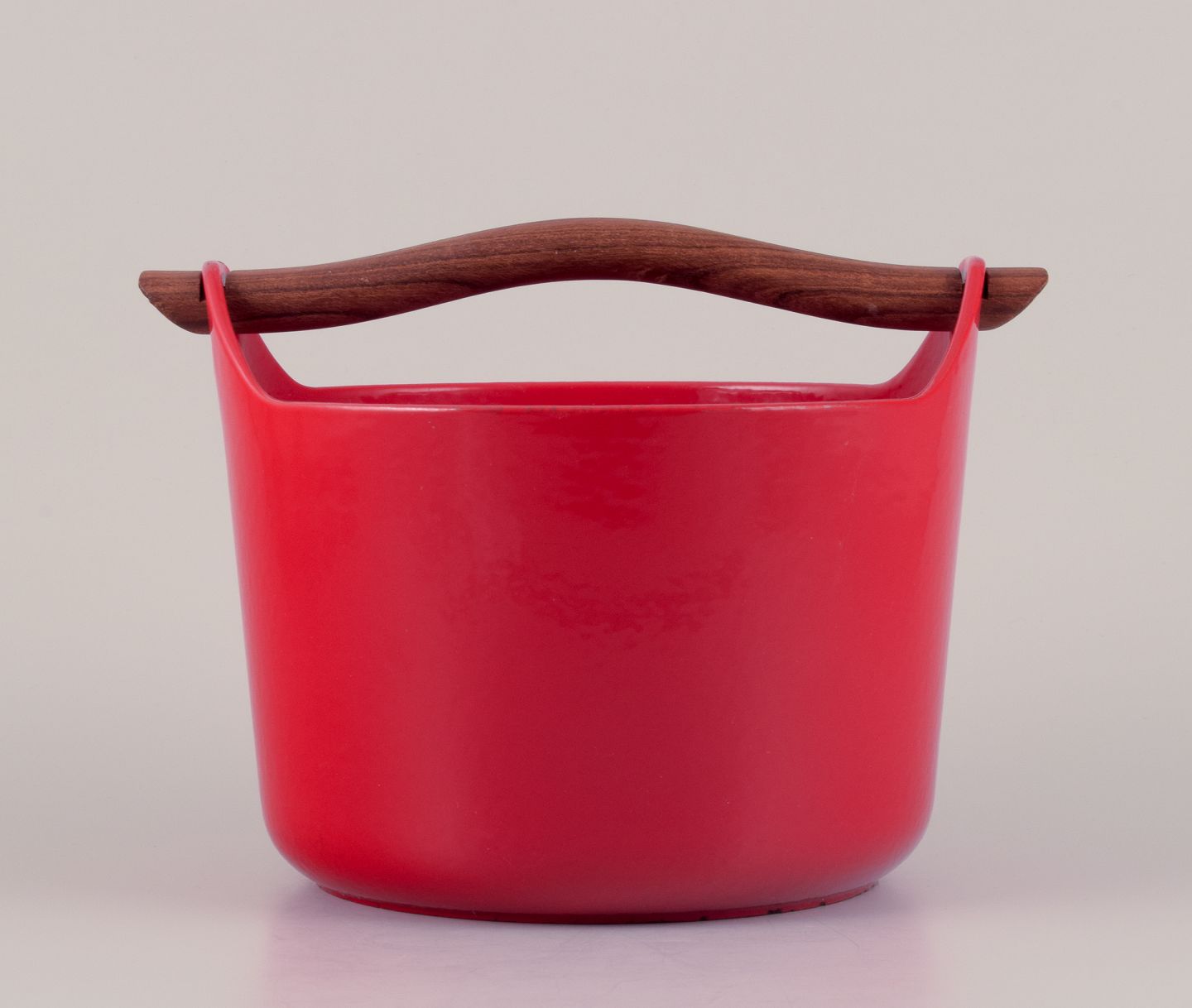 Timo Sarpaneva for Rosenlew, Finland. Cast iron pot in red enamel with a wooden handle.