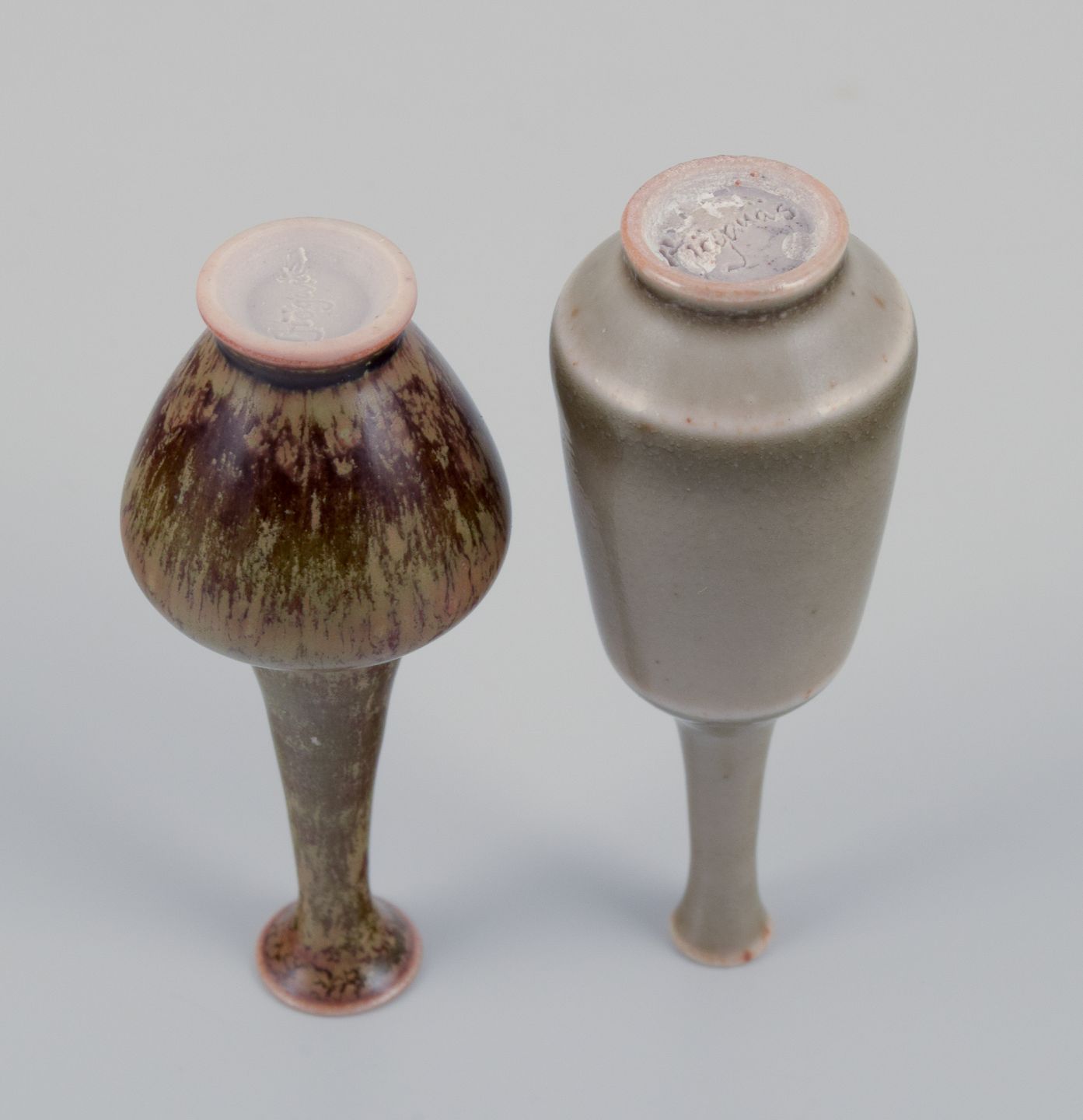 John Andersson for Höganäs, Sweden. A set of five unique miniature ceramic vases in various shapes and glazes. From the 1960s/70s. All in perfect condition. All signed. Dimensions: From H 50 to 80 mm x W 21 mm.