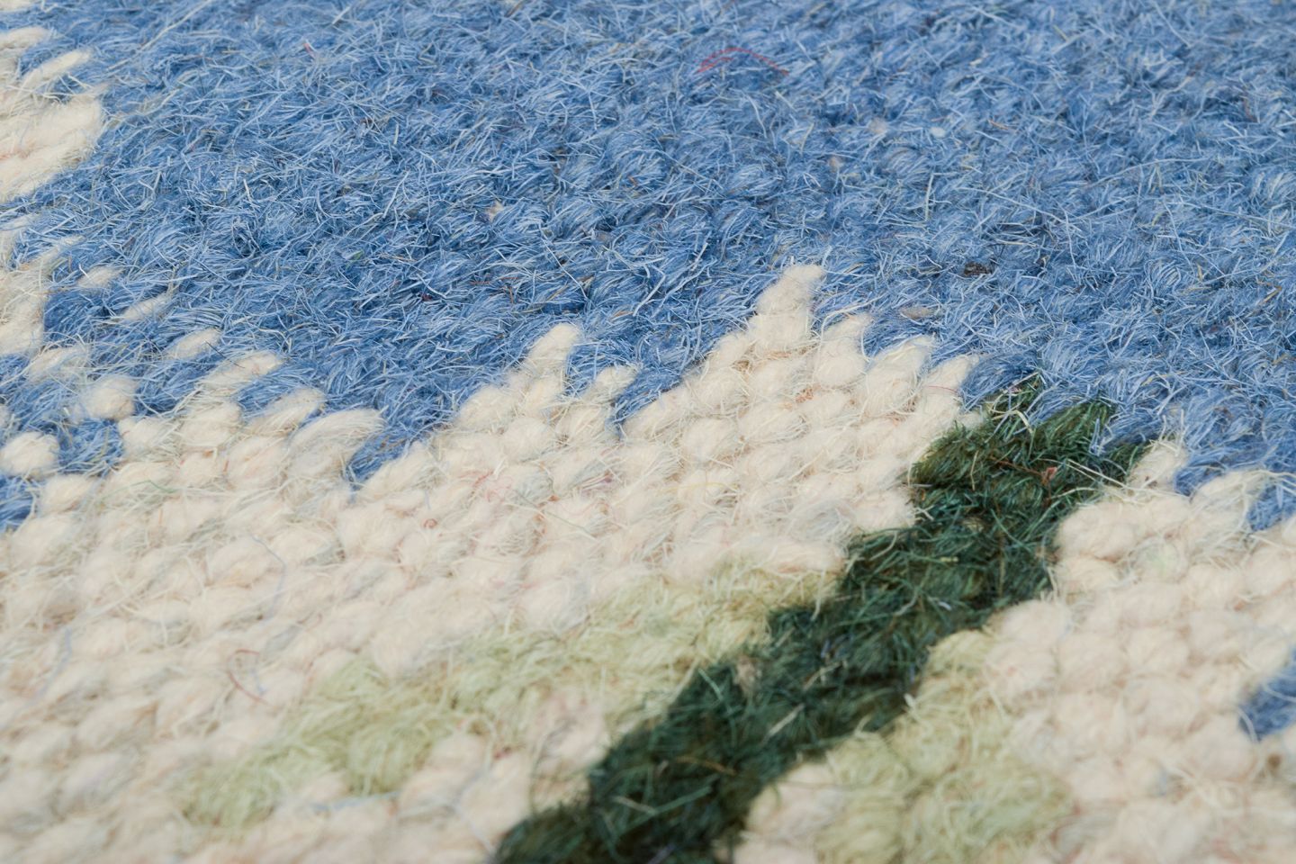Swedish handwoven carpet in pure wool. Rölakan technique. Designed with flowers on a blue background. Mid-20th century. Perfect condition. Dimensions: 145 cm x 72 cm.