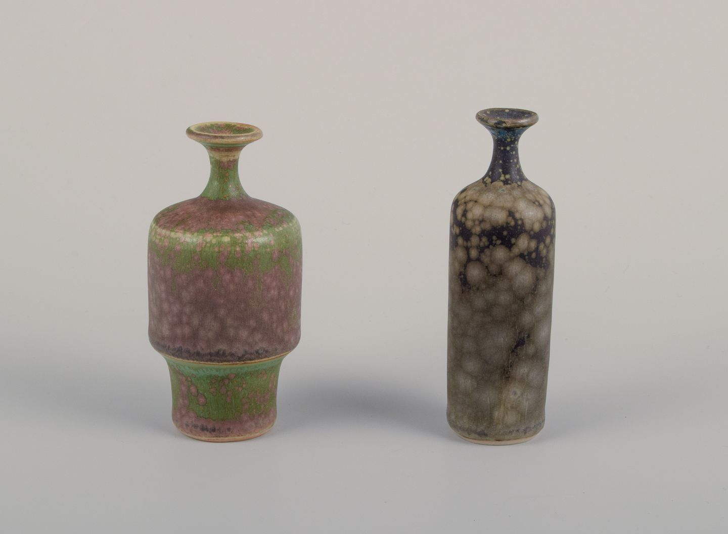 Rolf Palm (1930-2018), svensk keramiker. To unika miniaturevaser med glasur i blågrå og grønne og lilla nuancer. 1970’erne. Signeret. Perfekt stand. Blågrå: H 10,0 cm. x D 3,0 cm. Grøn: 9,2 cm. x D 4,5 cm.