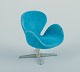 Arne Jacobsen, miniaturer af "Svanen" i turkist stof samt shakerbord. I flot stand med naturligt brugspræg og snavs. Ca. 1970’erne. Bord: D 8,0 cm. x H 3,6 cm. Stol: H 6,0 cm. x B 5,3 cm.