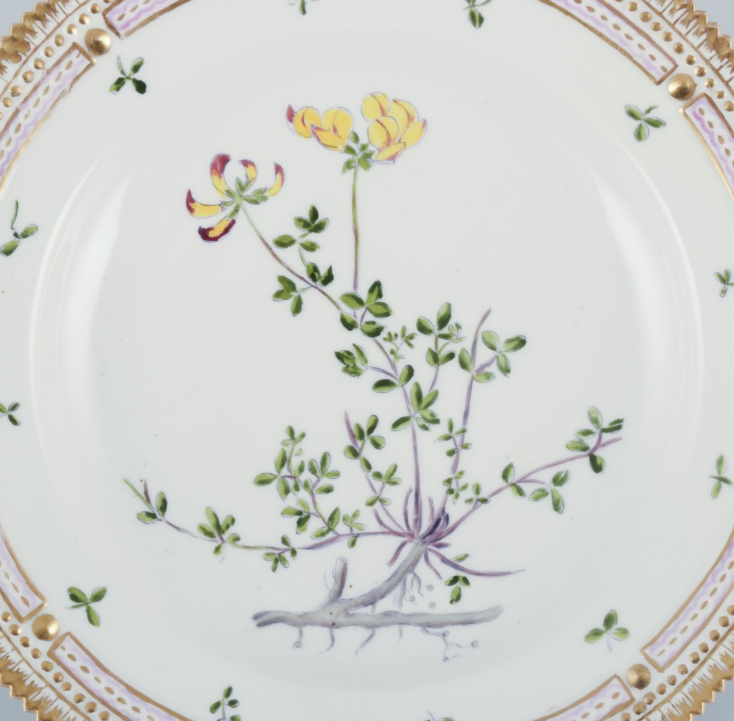 Middagstallerken i håndmalet porcelæn med blomster og gulddekoration. Hjemmedekoreret.