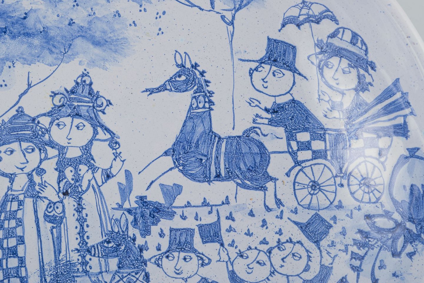 Stor oval keramikskål håndmalet i blåt. Motiv af gæster i hestevogn på vej til fest på slottet.