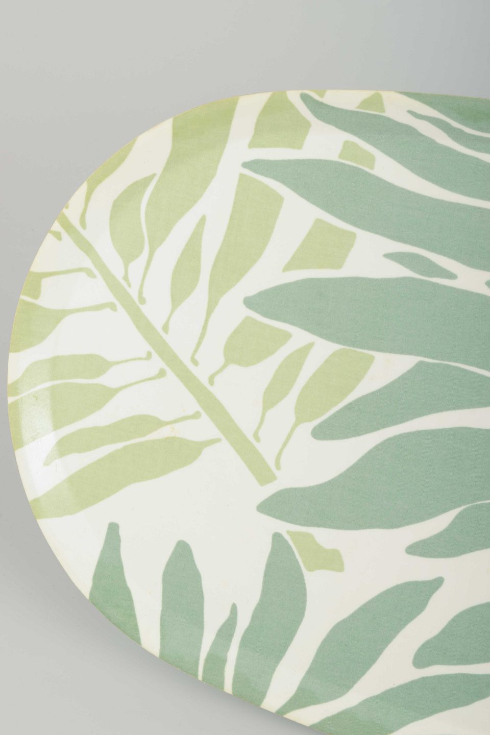 Oval serveringsbakke i formpresset træ med pålimet laminat. Dekoreret med bladmotiv i grønne og lysegrønne nuancer.