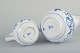 Organisk formede porcelænskander med hvid grundglasur og håndmalet blå blomsterdekor i underglasur. Klassisk bølget rand og svungen hank.