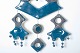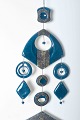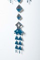 Håndlavet keramisk vægdekoration i geometriske og organiske former, med glasur i blå og hvide nuancer. Ophænget består af flere sammensatte elementer i et skulpturelt og dekorativt udtryk.