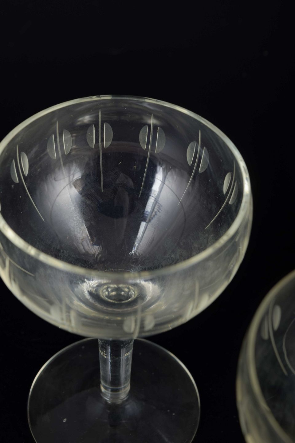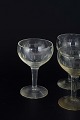 Mundblæste glas med kort stilk og bred, lav bowle. Dekoreret med indgraveret mønster i form af lodrette linjer med ovale elementer.