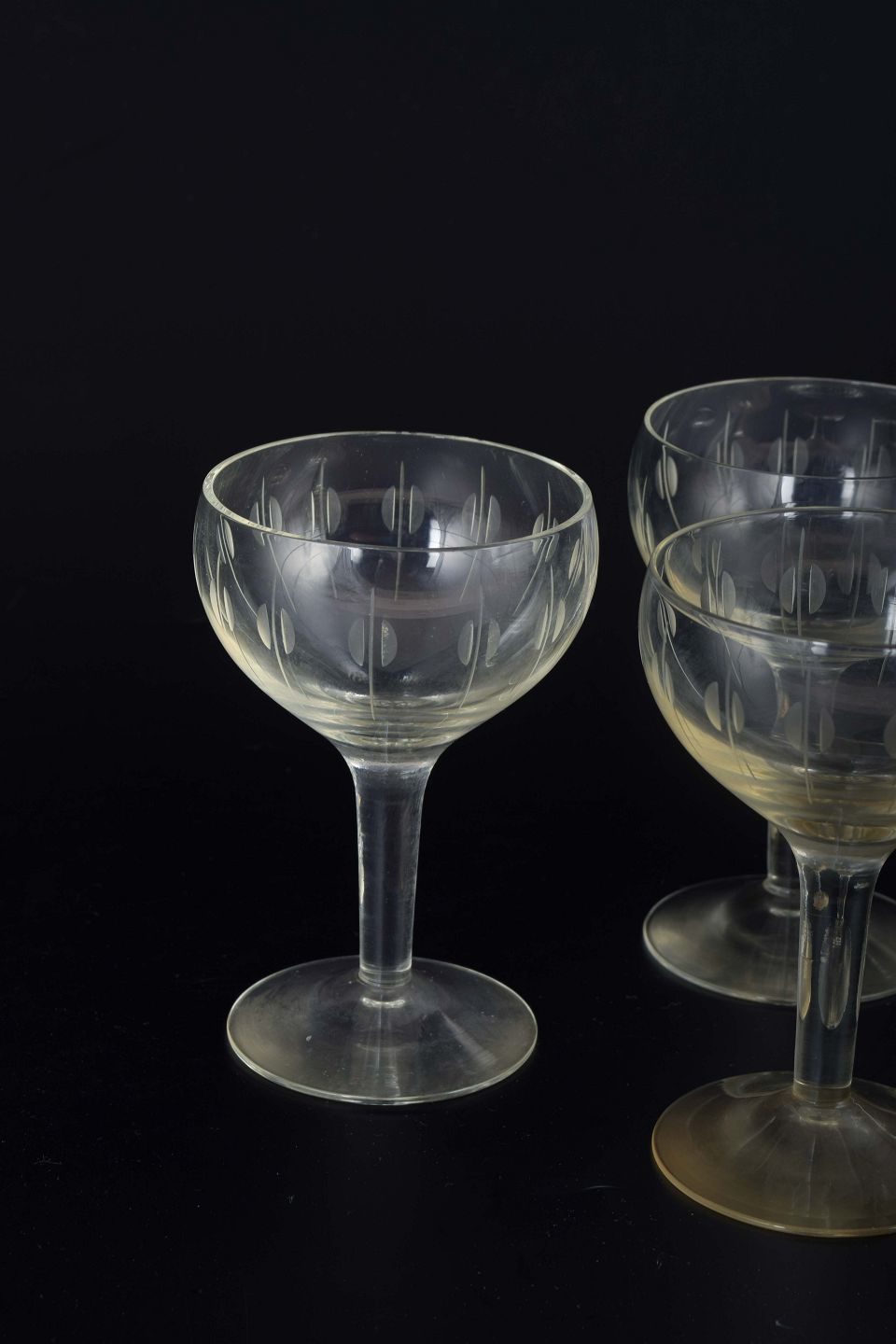 Hedvinsglas fra midten af 1900-tallet kendetegnes ofte ved håndgraverede ornamenter og enkle, funktionelle former. Disse glas er typiske for tidens bordkultur, hvor både æstetik og brugsværdi blev vægtet højt. Serien af seks gør dem til et dekorativt og funktionelt sæt, velegnet både til brug og som samlerobjekt.