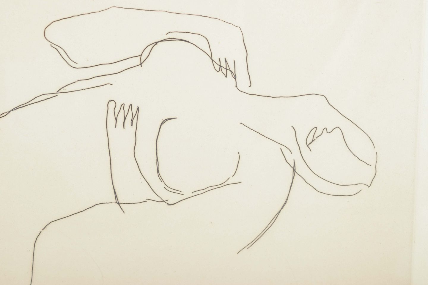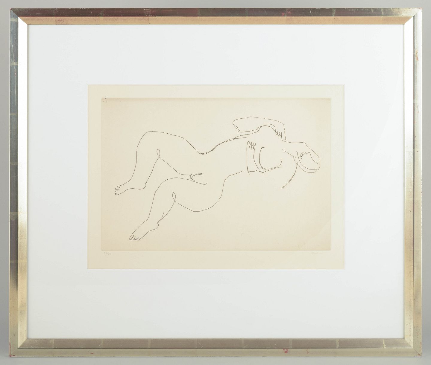 Et grafisk værk med motiv af en nøgen kvindeskikkelse i hvilende positur, udført i en enkel, lineær stil med kubistisk præg. Med få men præcise streger skaber Fautrier en intens og raffineret figurkomposition, der balancerer mellem naturalisme og abstraktion.