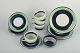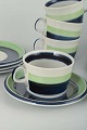 Samling bestående af kagetallerkener, kopper, underkopper og sukkerskål i fajance med hvid glasur, grøn og blå dekoration.