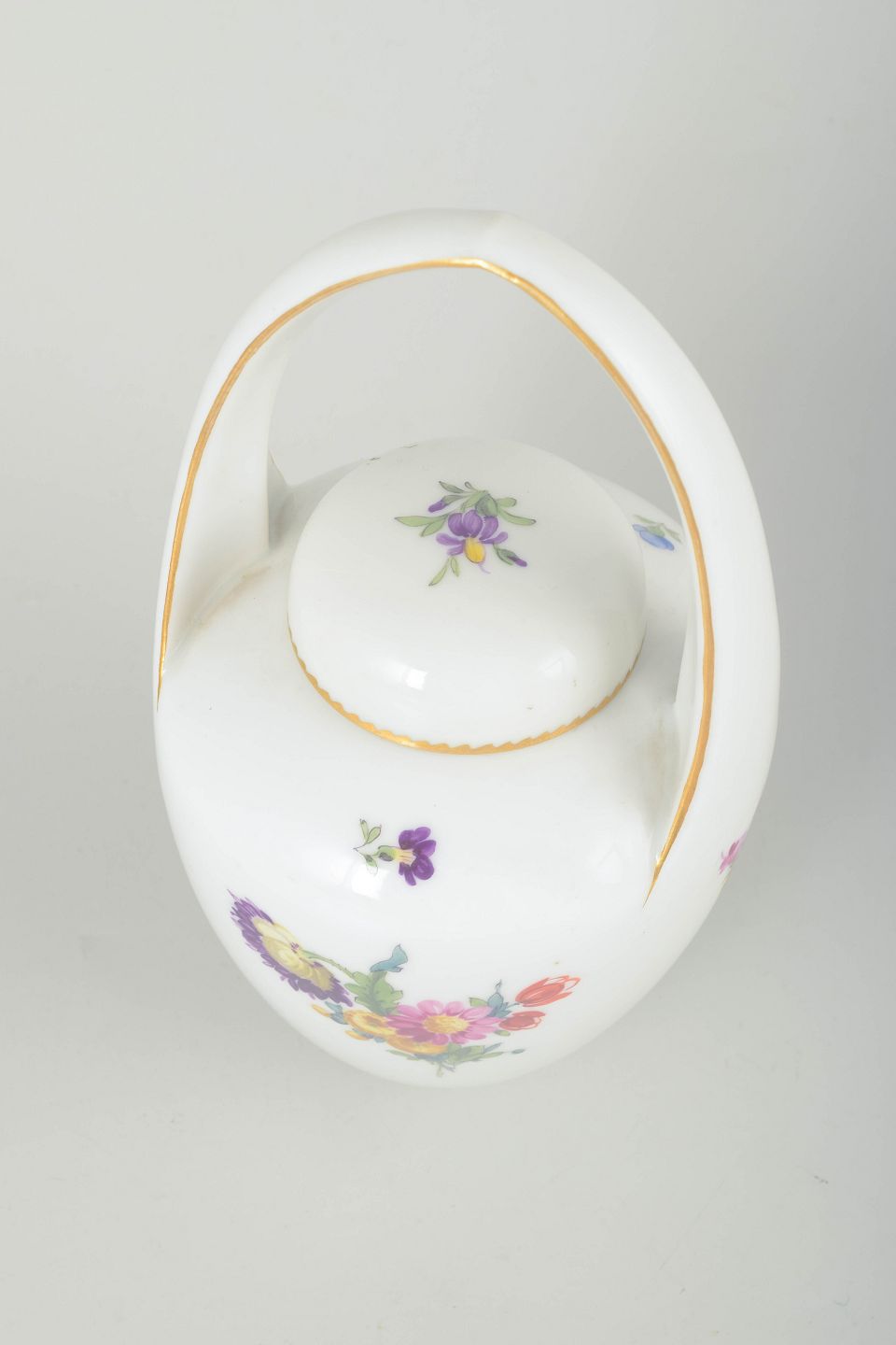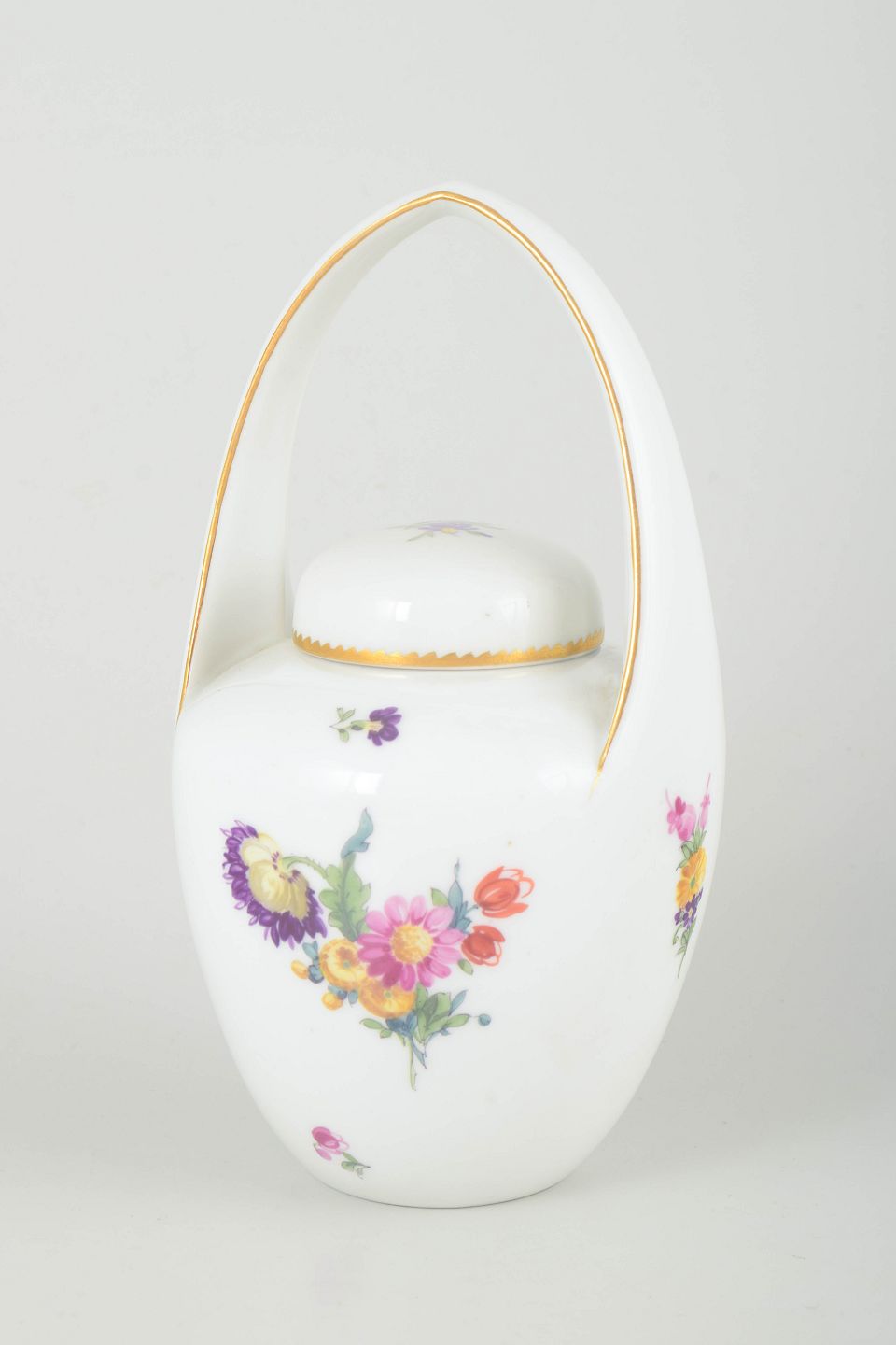 Antik porcelænskrukke med låg og elegant bueformet hank, dekoreret med håndmalede blomster i det klassiske “Sachsisk Blomst” mønster og guldkant.