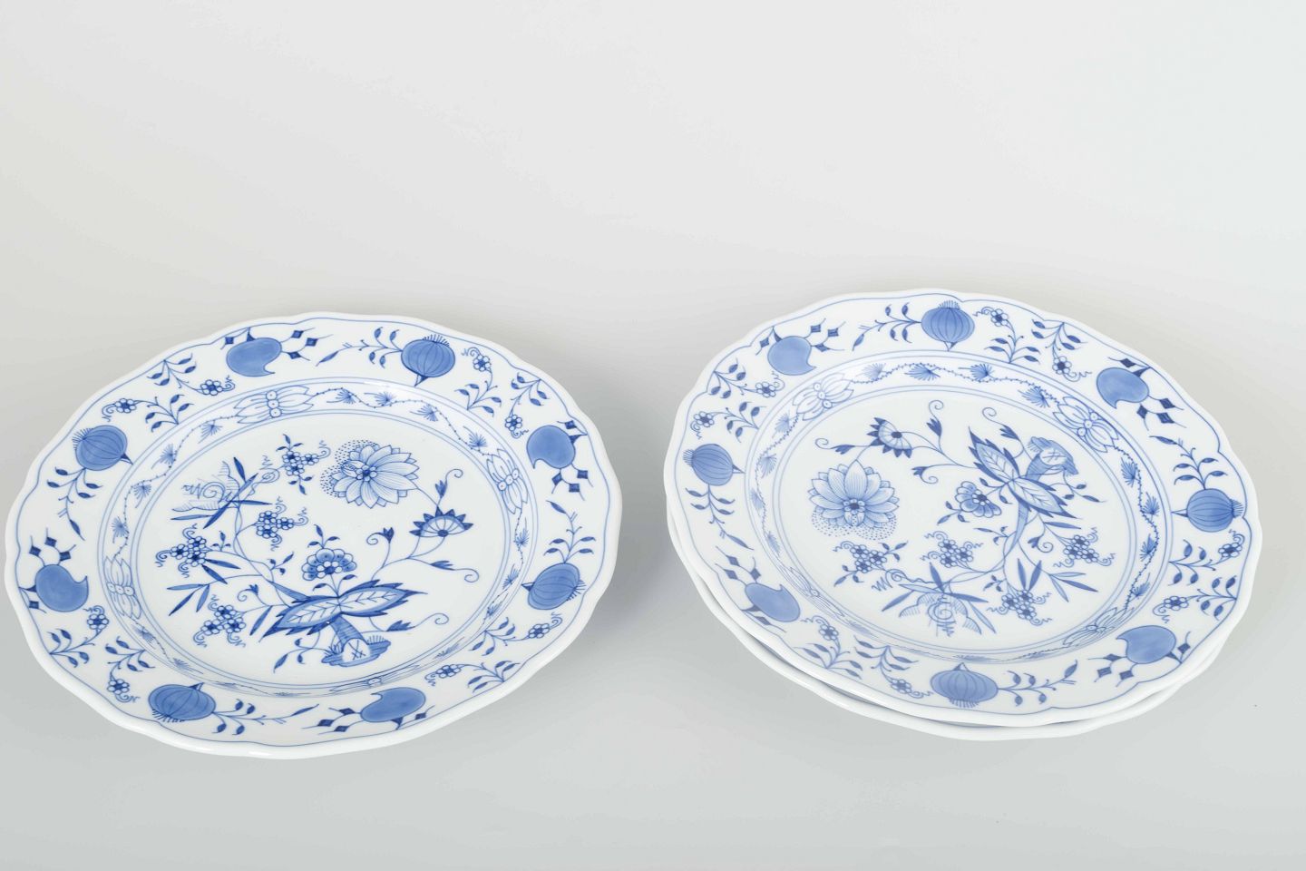 Tre håndmalede porcelænstallerkener i det klassiske “Løgmønstret” (Blue Onion) mønster. Dekoreret i underglasurblå med bølget kant og elegant ornamentik.