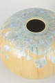 Drejet stentøjsvase med krystalglasur i lyseblå og beige nuancer. Dekorationen danner et organisk, næsten floralt mønster omkring skulderen. Signeret i monogram i bunden.