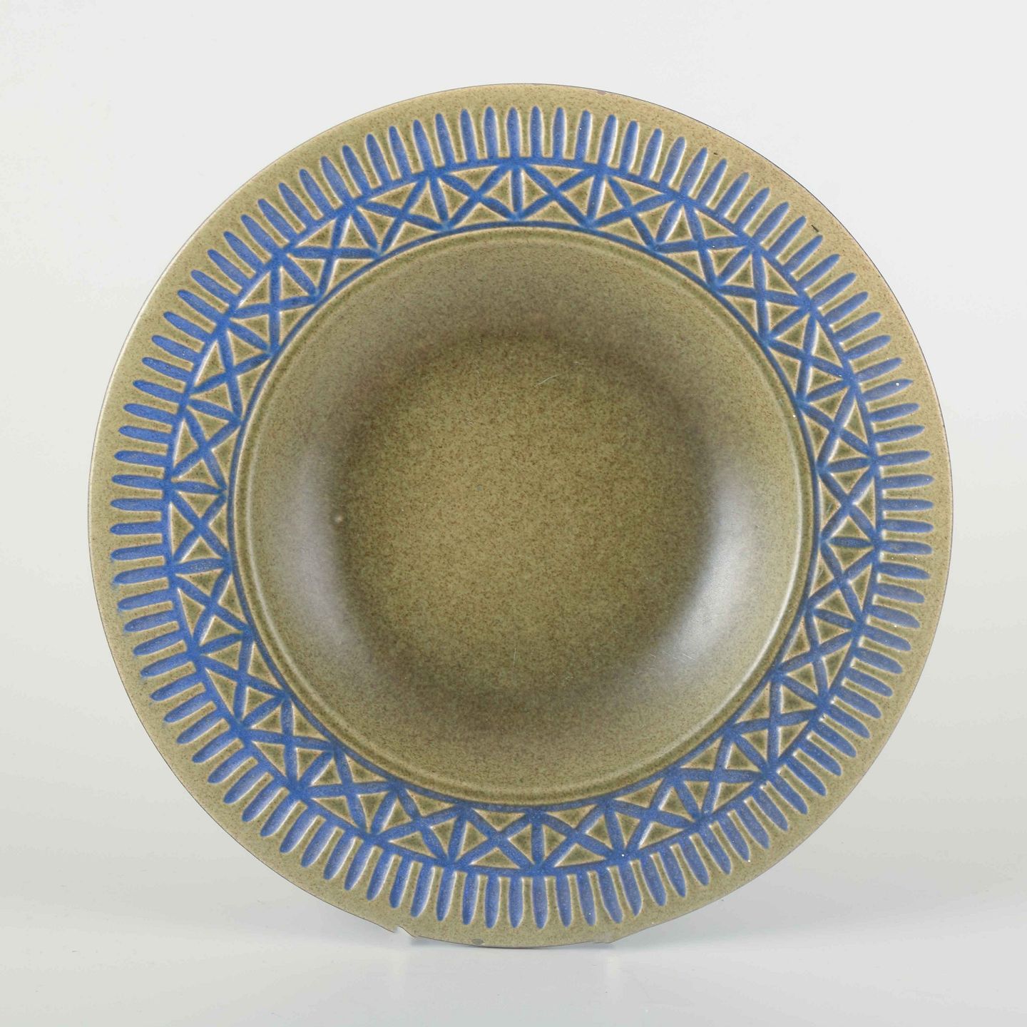 Dekorativ skål i stentøj med olivengrøn glasur og geometrisk reliefdekoration i blå og sandfarvede toner omkring randen.