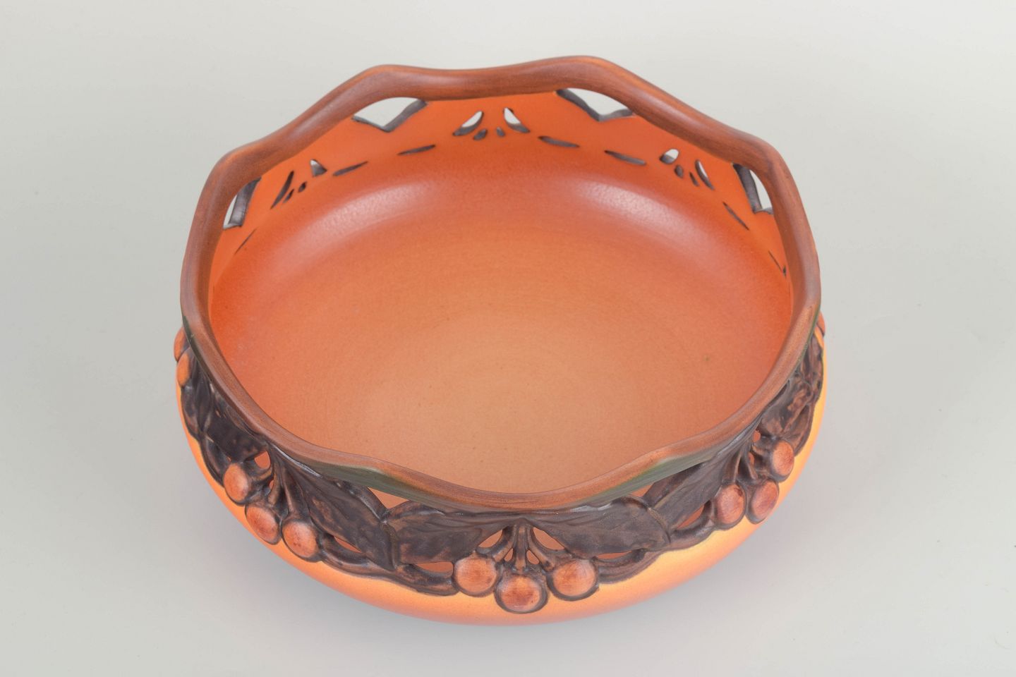 Art Deco-/sen Art Nouveau-inspireret skål i glaseret keramik med gennembrudt bort og plastisk modelleret dekor af kirsebær og blade i brune og grønne nuancer. Mat orange grundglasur med elegant toning mod bunden.