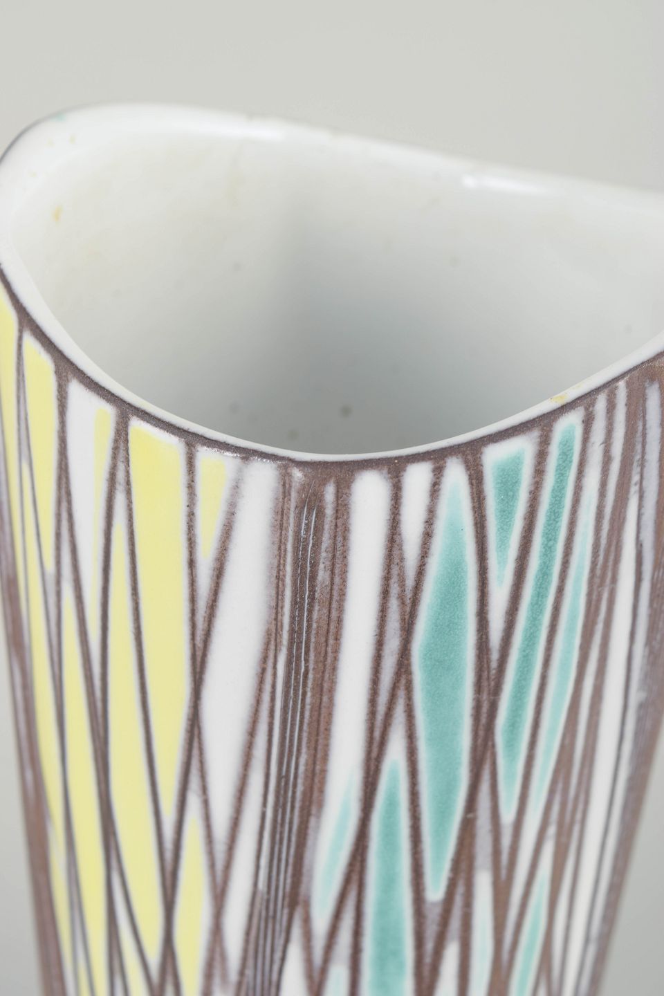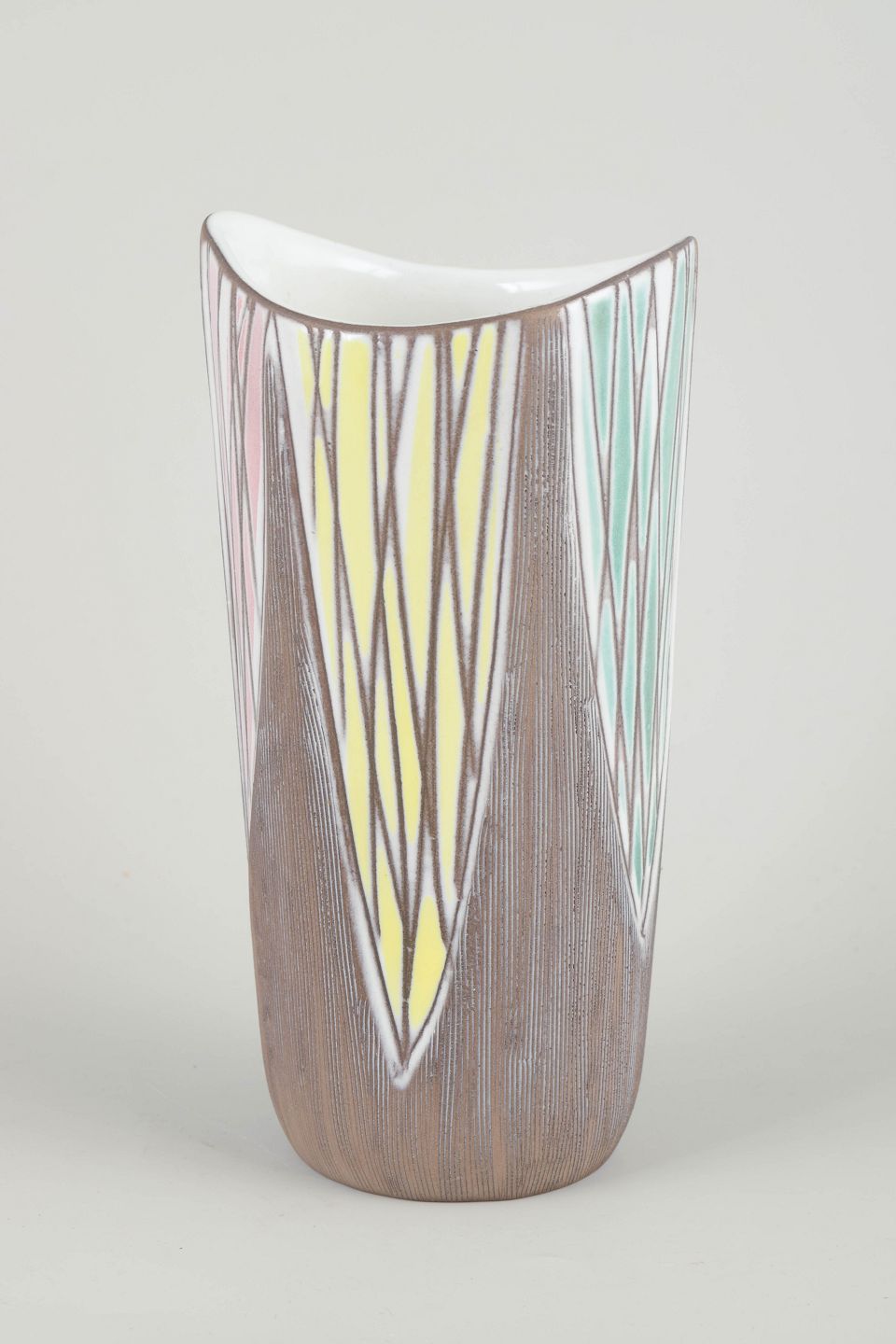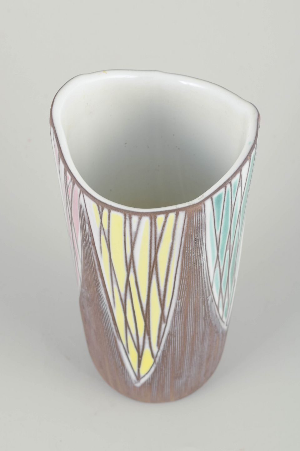 Dekorativ keramikvase med let asymmetrisk form og håndmalet geometrisk dekoration i pasteltoner af gul, rosa og mintgrøn på brun, indgraveret baggrund. Et klassisk eksempel på Simmulsons karakteristiske stil fra perioden med kombinationen af teksturerede overflader og bløde farver.