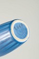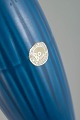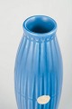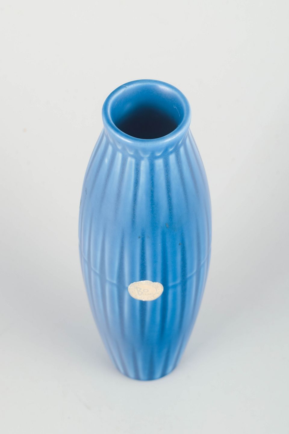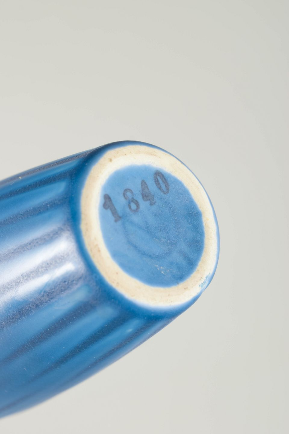 Elegant ribbed vase in matte blue glaze with a refined functionalist shape. Original “Bo Fajans Gefle, Made in Sweden” label preserved on the front.