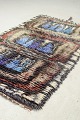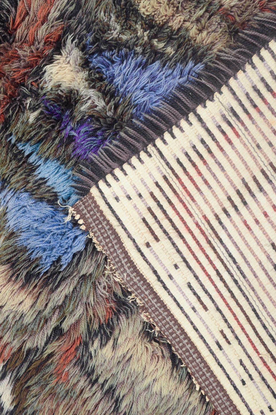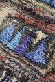 Håndknyttet rya-vægtæppe i uld med geometrisk mønster i blå, lilla, beige og brunlige nuancer. Tæppet har ophængssnor og er udført i klassisk skandinavisk stil fra perioden, hvor tekstilkunsten bevægede sig mod mere dekorative og kunstneriske udtryk.