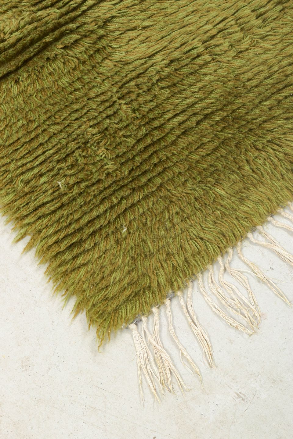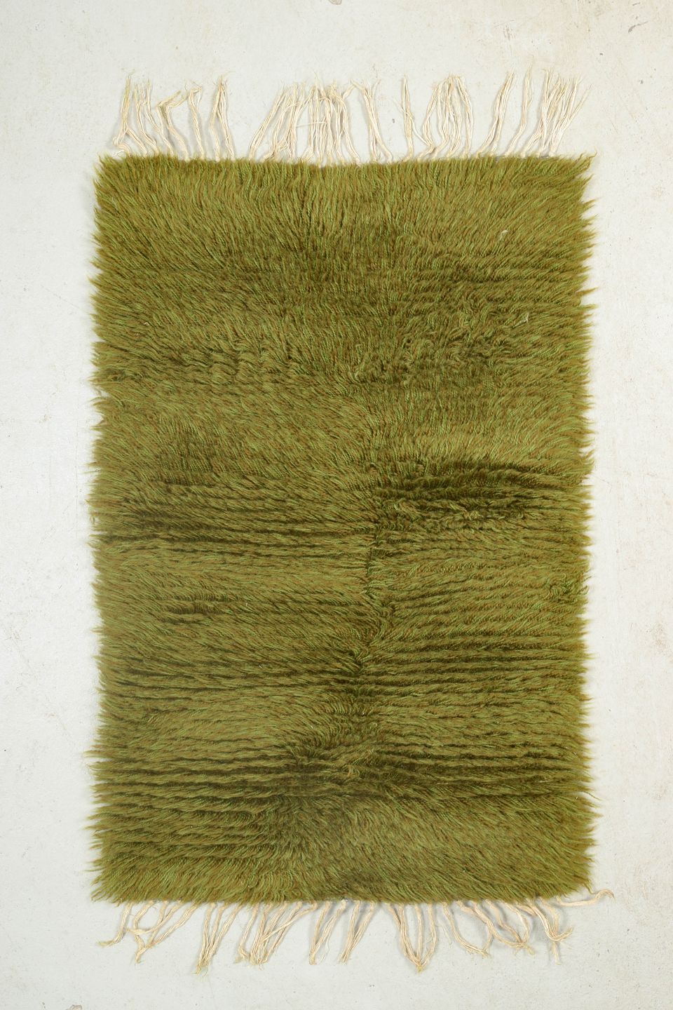 Håndknyttet rya-tæppe i ren uld i olivengrøn nuance med ensfarvet, strukturel overflade. Et enkelt og elegant eksempel på skandinavisk tekstildesign fra perioden, hvor farve og tekstur fremhævede materialets naturlige kvaliteter.