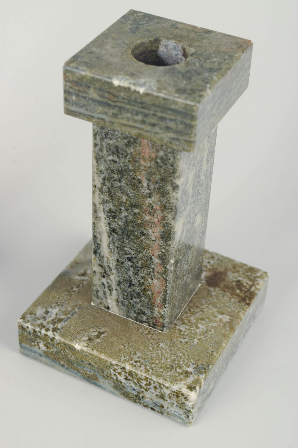Par marmorstager i grå- og grønmeleret sten med geometrisk, minimalistisk formgivning. Håndforarbejdede med elegant proportioneret fod og top.