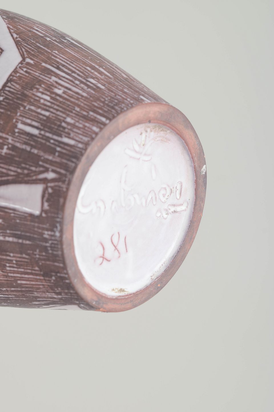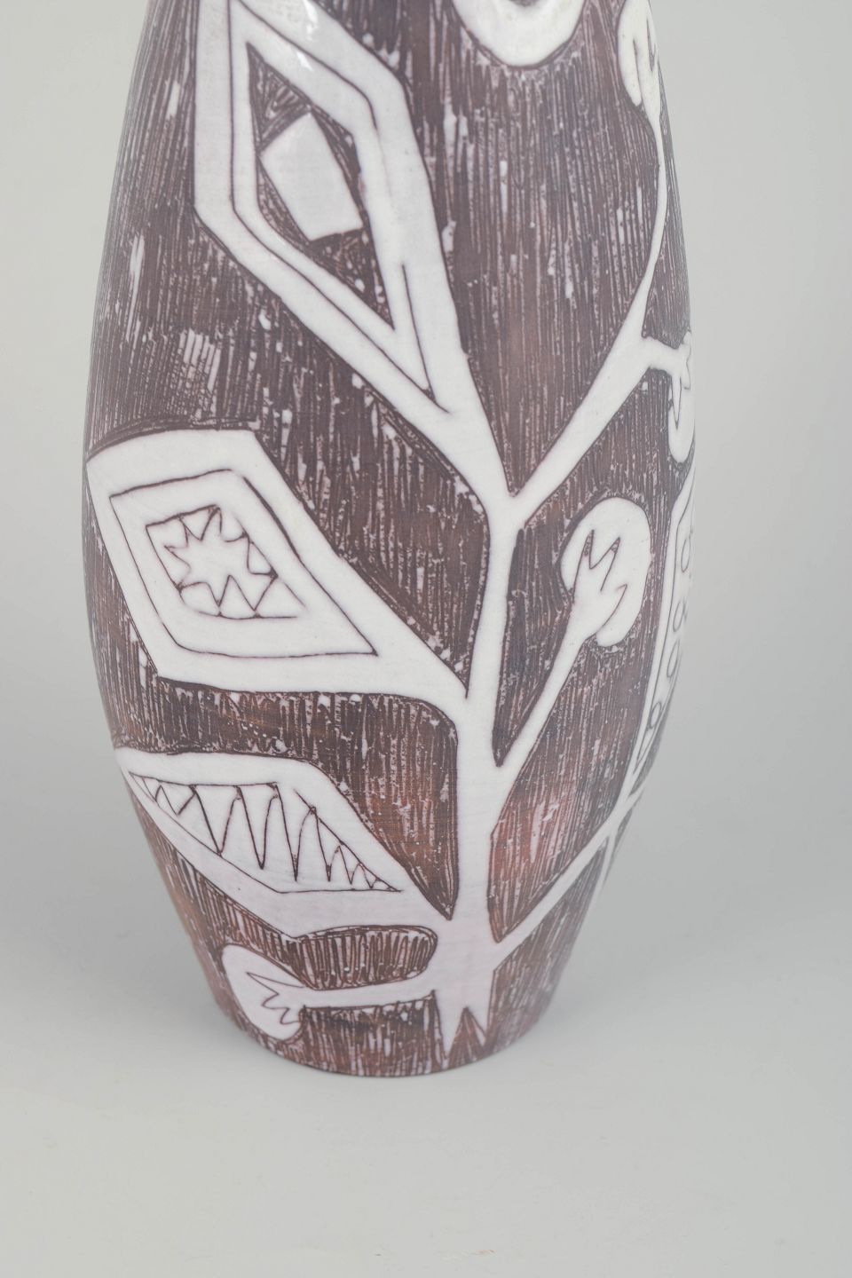 Håndlavet keramisk vase med markant asymmetrisk form og dekor i indridset grafisk mønster under brun og hvid glasur. Et karakteristisk eksempel på svensk studiokeramik fra 1960’erne med tydelig kunstnerisk signatur.