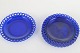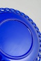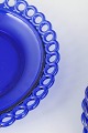 Smukke asietter i dyb koboltblå glas med dekorativ gennembrudt kant i typisk Gullaskruf design. Elegant svensk glasarbejde med klassisk farvet glas, der viser fabrikkens håndværksmæssige kvalitet og formsprog.