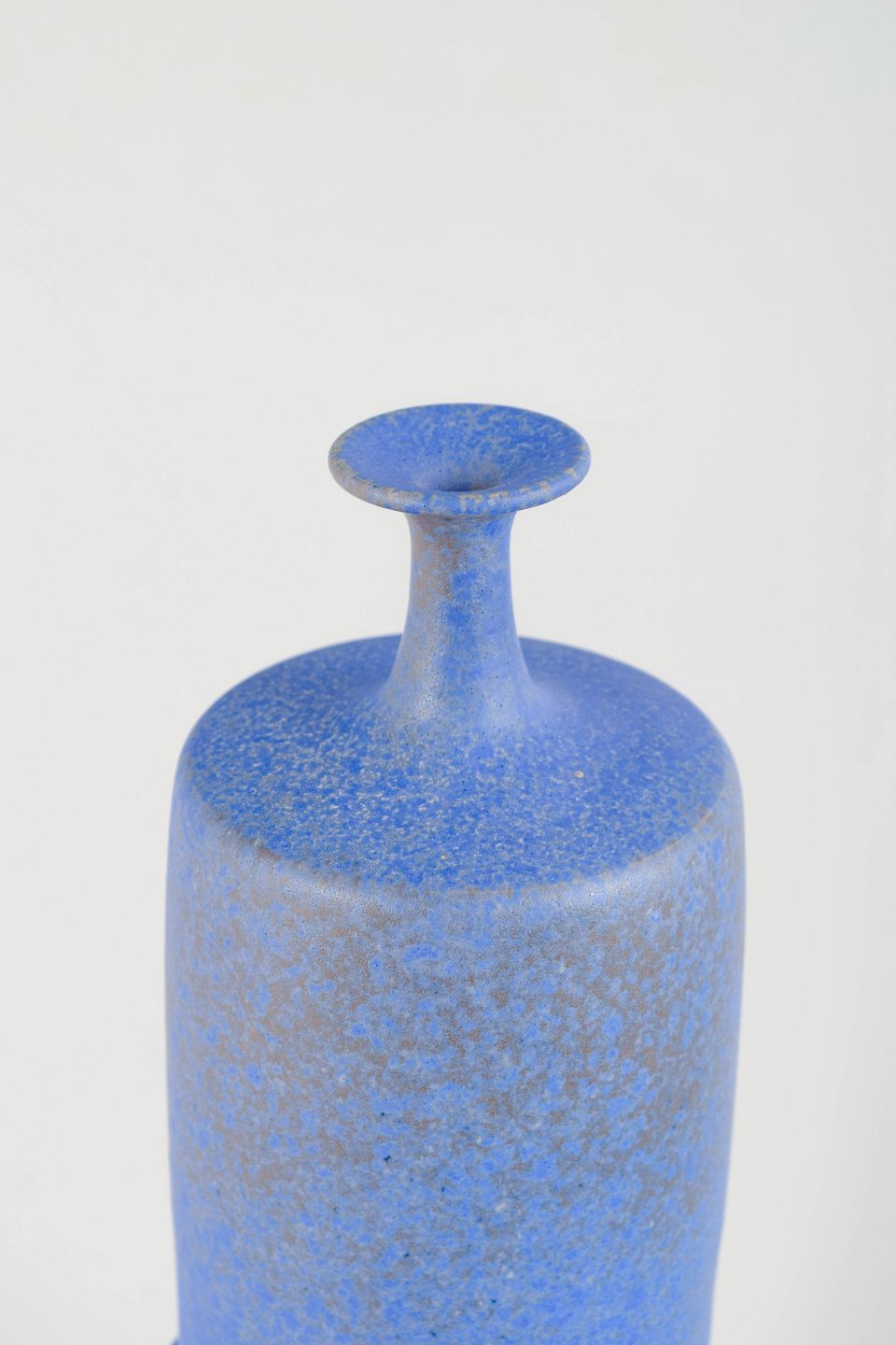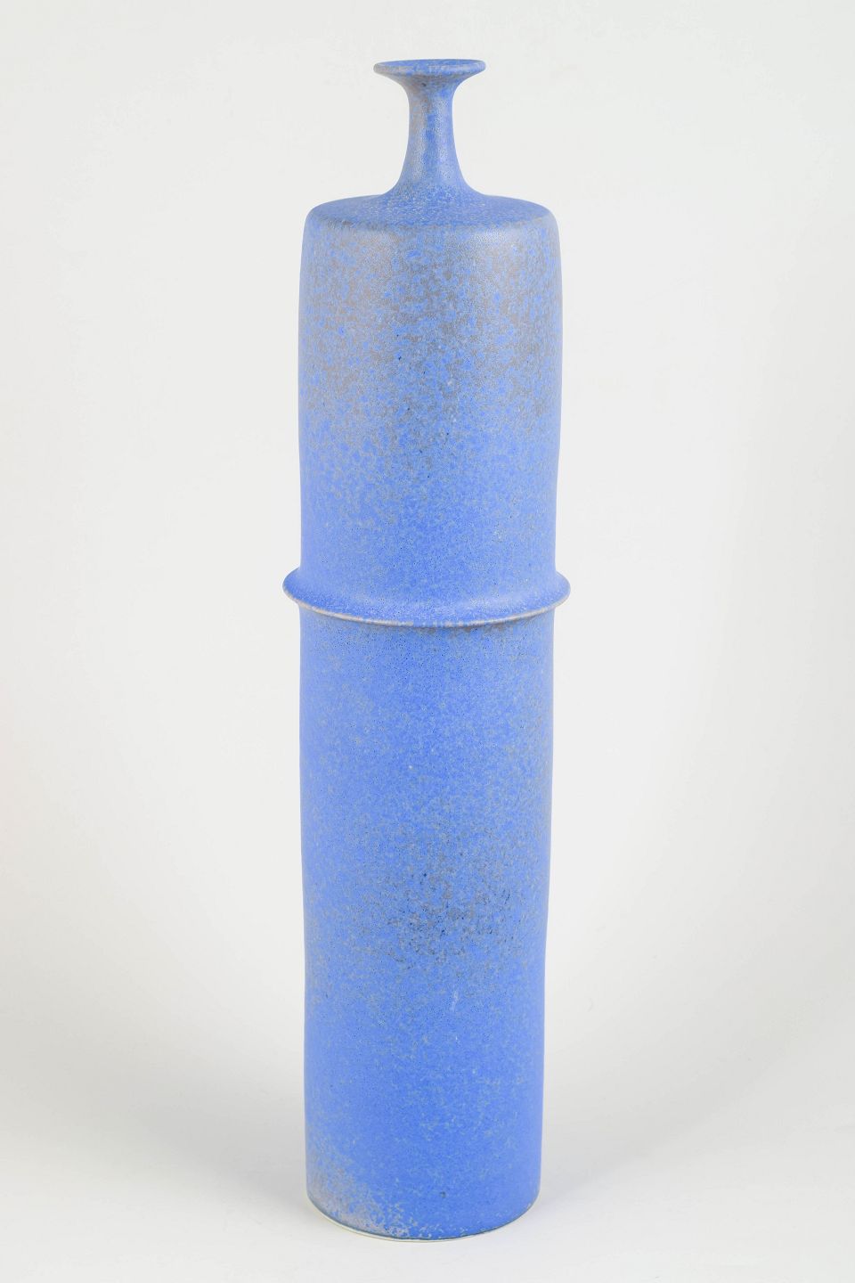 Meget stor, skulpturel studiekeramik-vase i cylindrisk form med karakteristisk todelt profilering og smal, opadstrittende hals. Udført i stentøj med levende, mat blå glasur og fine strukturelle variationer. Et markant og dekorativt unika-arbejde i stor skala.