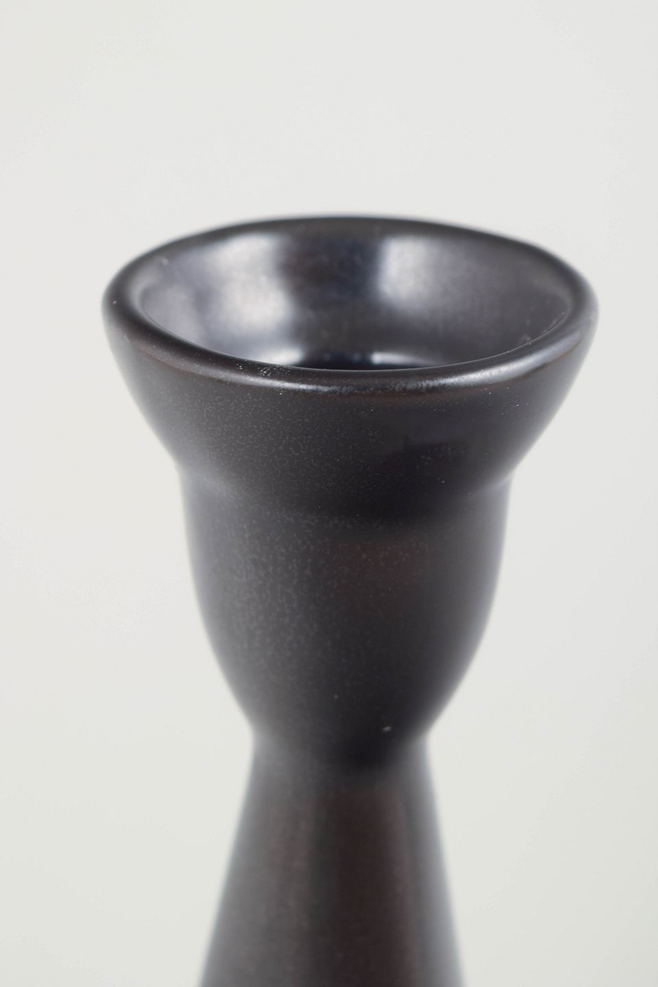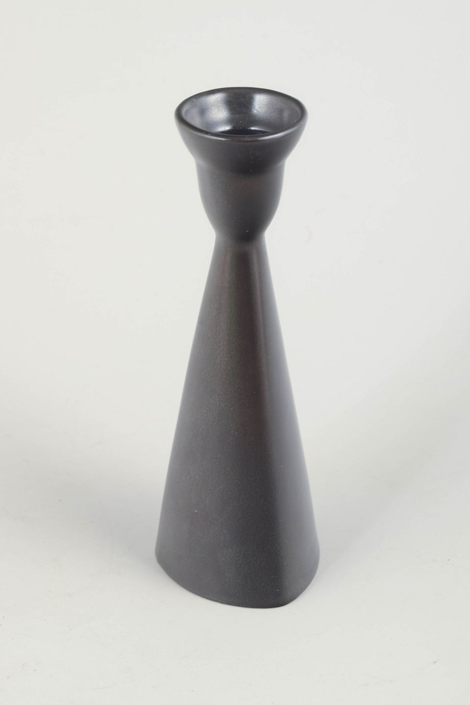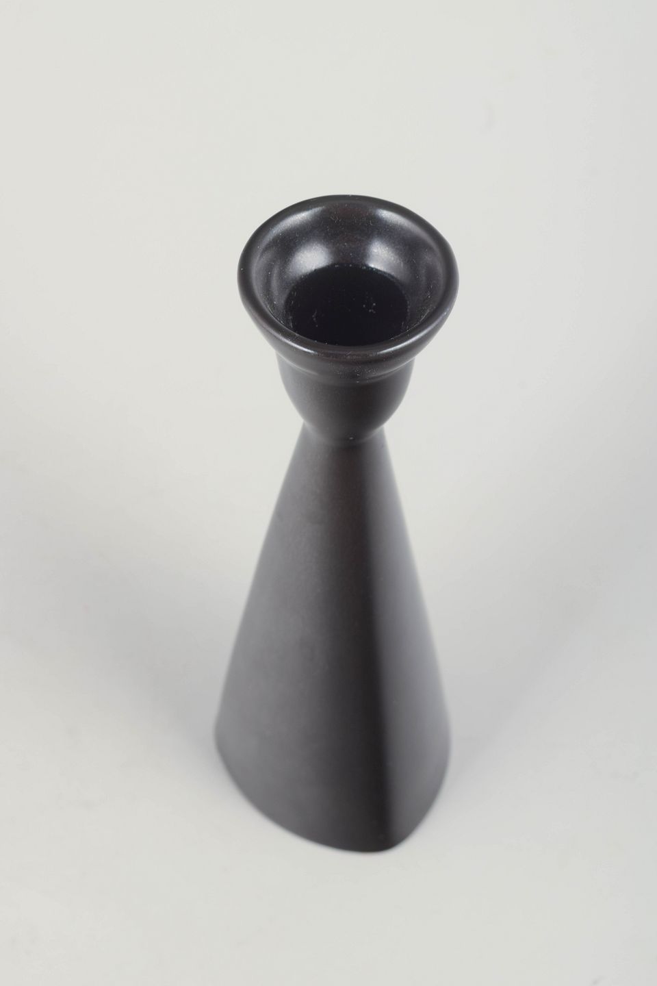 Elegant kegleformet lysestage i sortglaseret stentøj med glat, mat overflade og skålformet top.