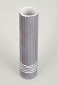 Stor, cylindrisk vase i stentøj med lodrette indskårne riller og hvide horisontale ringdekorationer.
