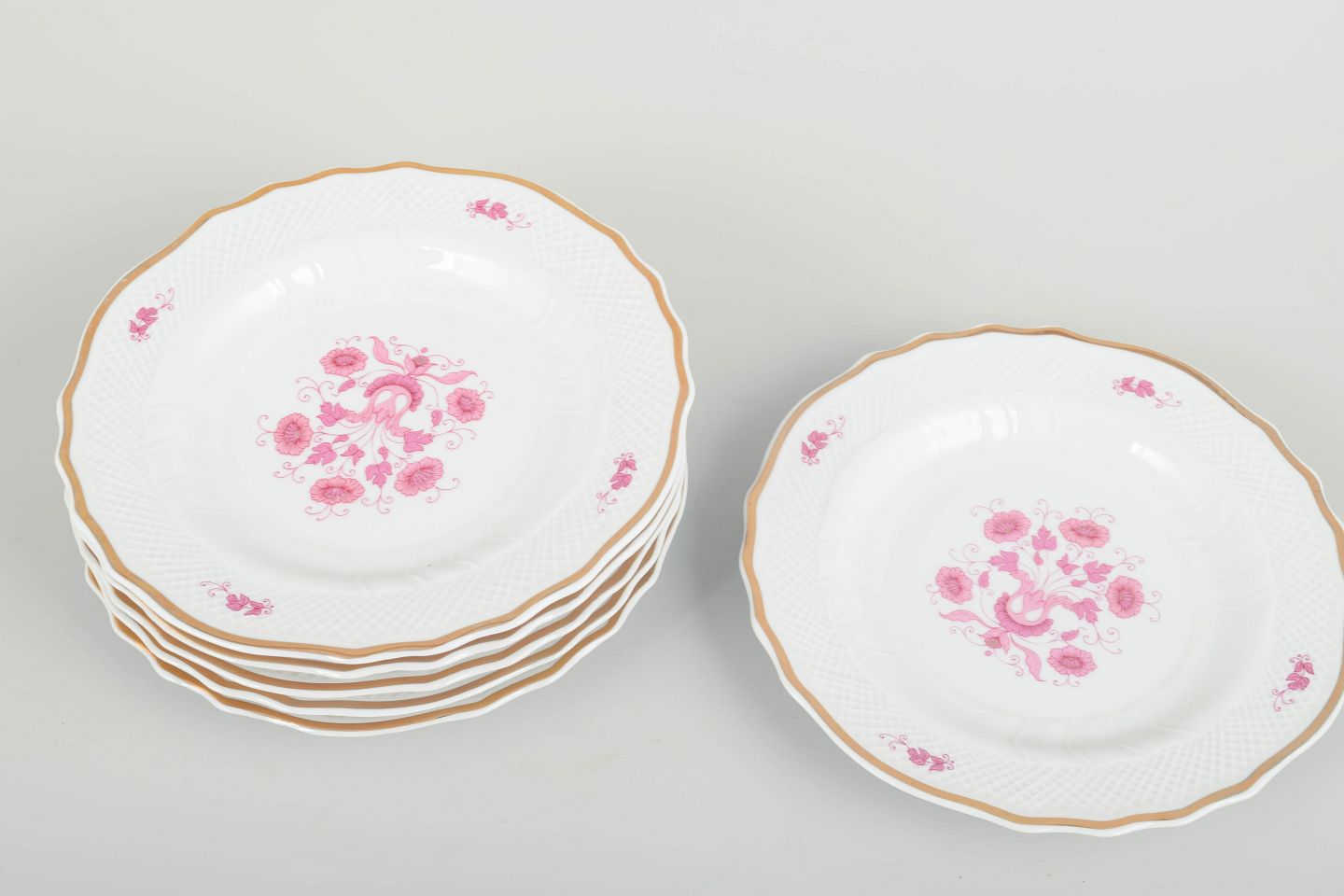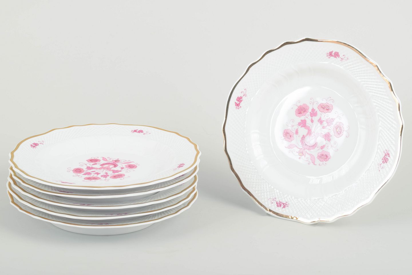 Set of six elegant porcelain salad plates with pink floral decoration and gilded rim, produced by the renowned Hungarian porcelain manufacturer Hollóháza.