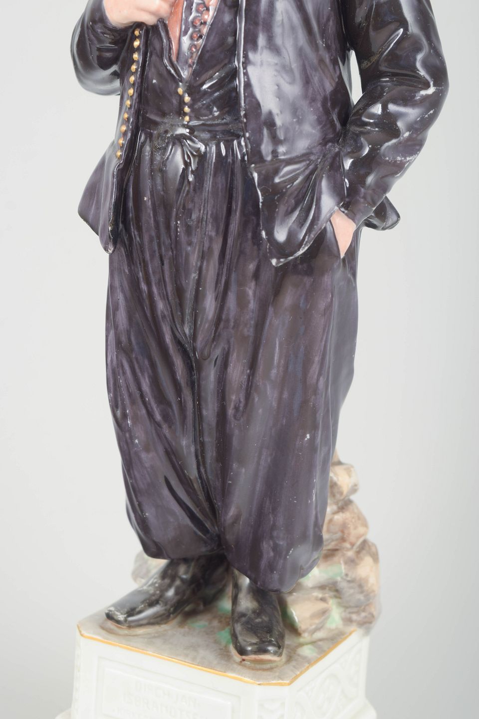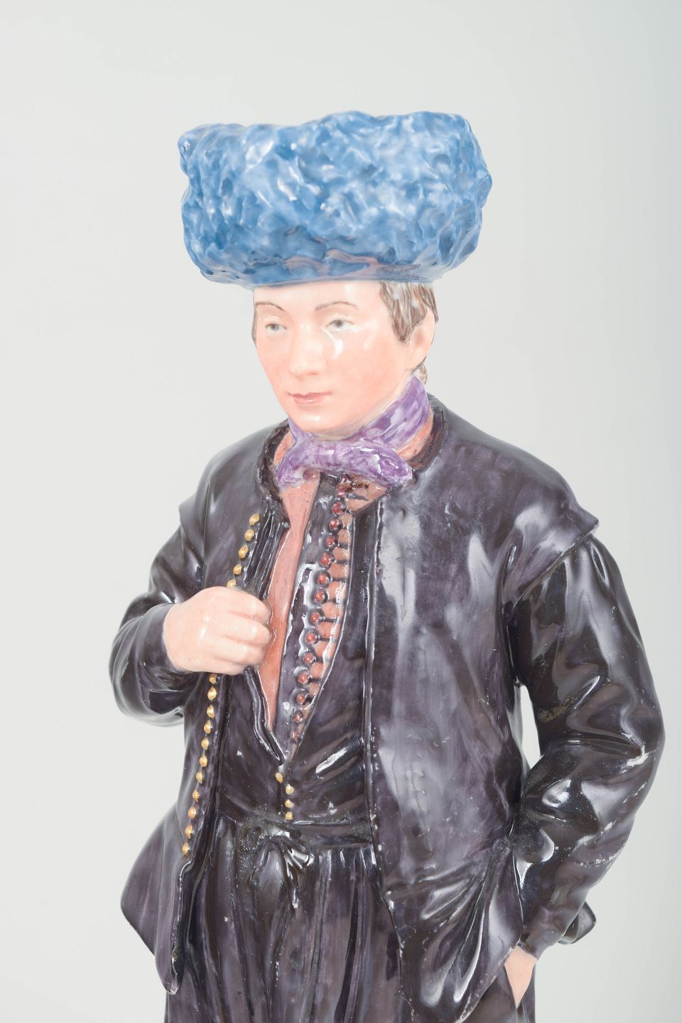 Håndmalet figur i overglasur, forestillende en mand i traditionel dragtskik, stående på klassisk rektangulær sokkel.