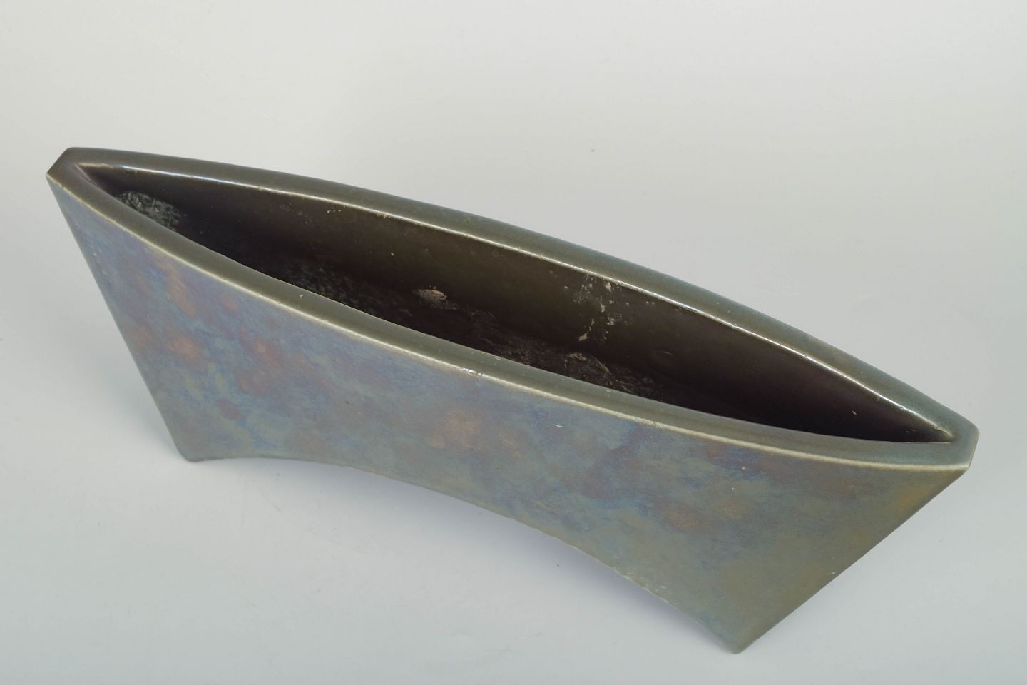 Håndglaseret og signeret vase i karakteristisk asymmetrisk form, udført i stentøj med diskret iriserende overflade og et stramt, moderne udtryk typisk for Mobach-værkstedets 1970’er-produktion.
