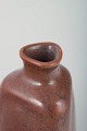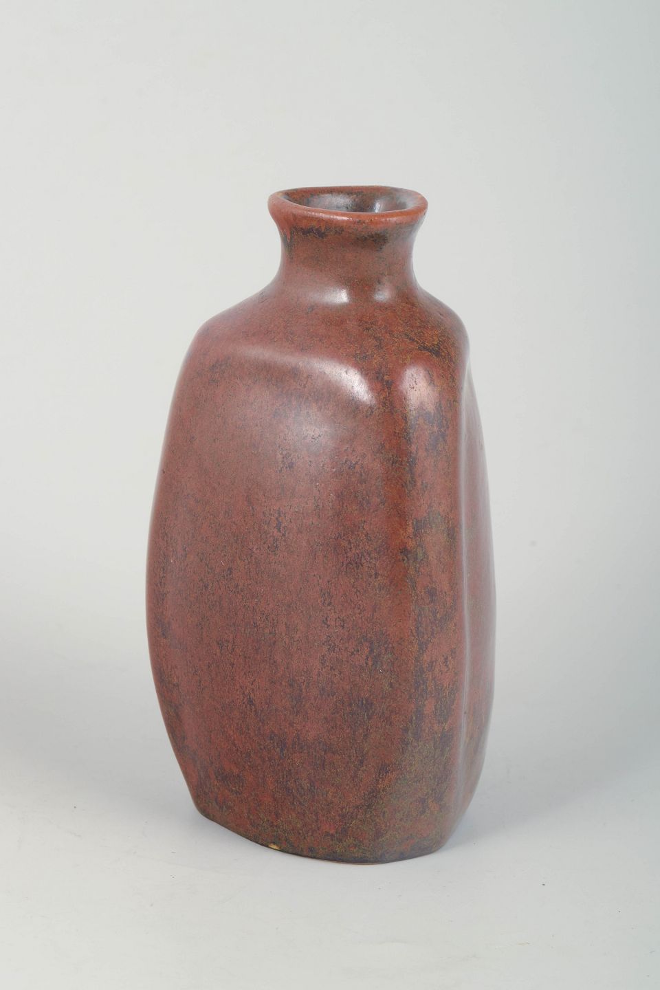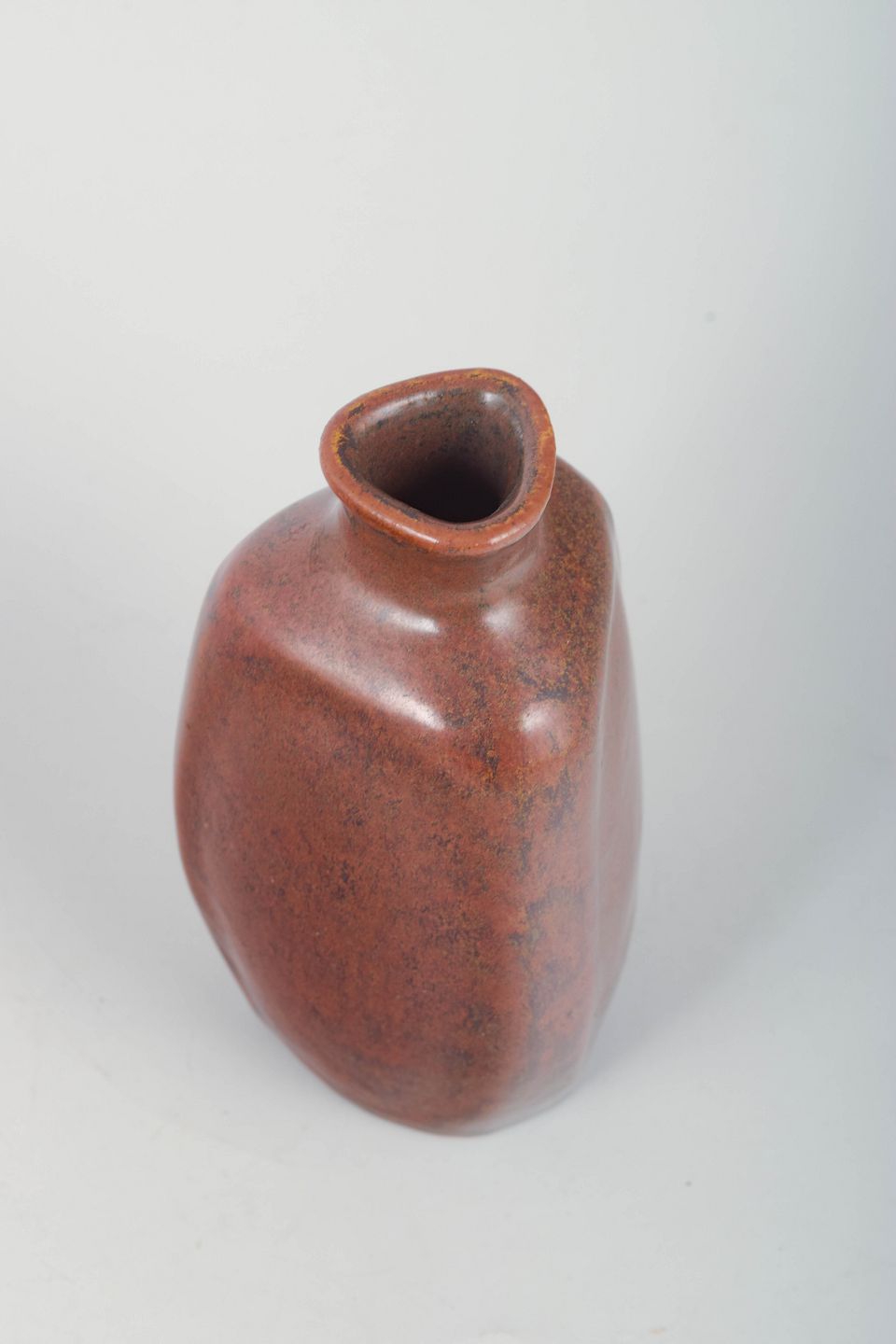 Håndlavet stentøjsvase i karakteristisk triangulær form med blød, afrundet geometri. Udført i en dyb rødbrun reduktionsglasur, som fremhæver værkstedets raffinerede overfladespil og stramme formsprog.