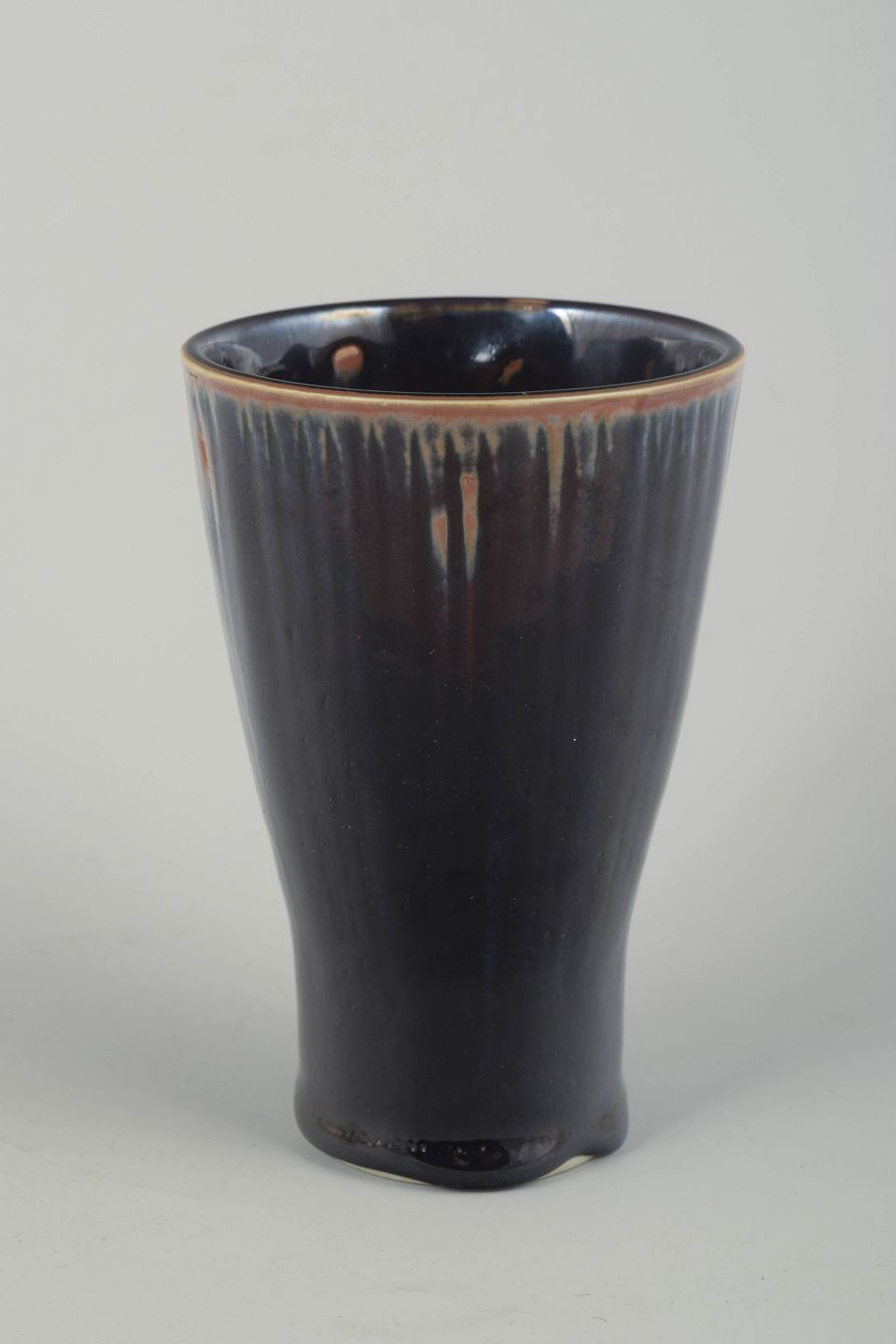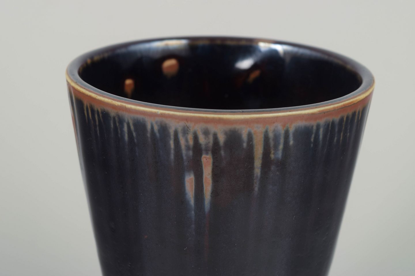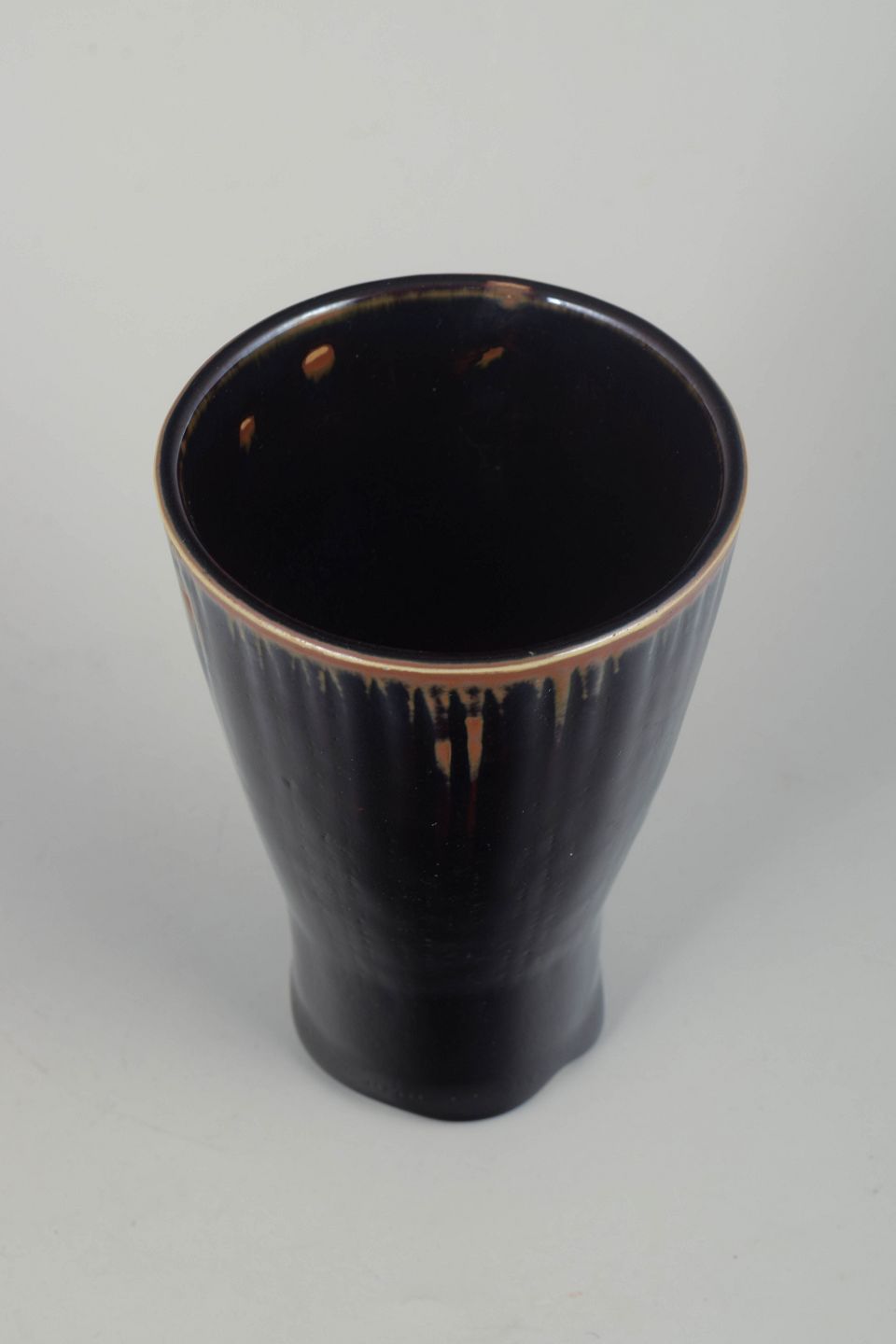 Høj, kegleformet vase i mørk glaseret stentøj med fine lodrette glasurstrøg, der afslører lysere nuancer mod kanten. Den enkle, elegante form og den dybe glasur er typisk for Rörstrands midtårhundrede-stentøj.
