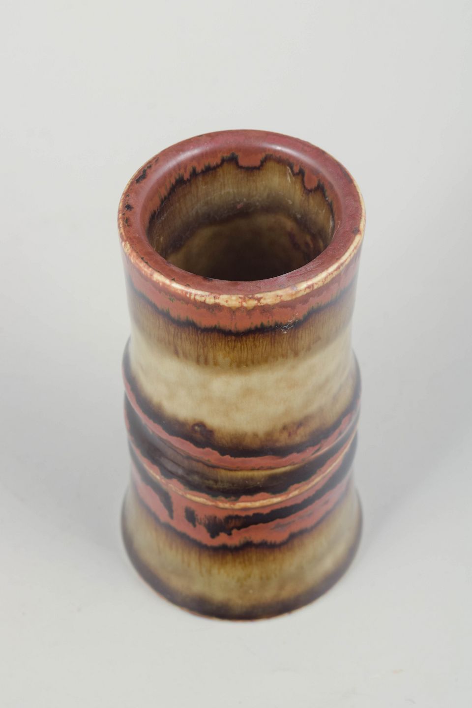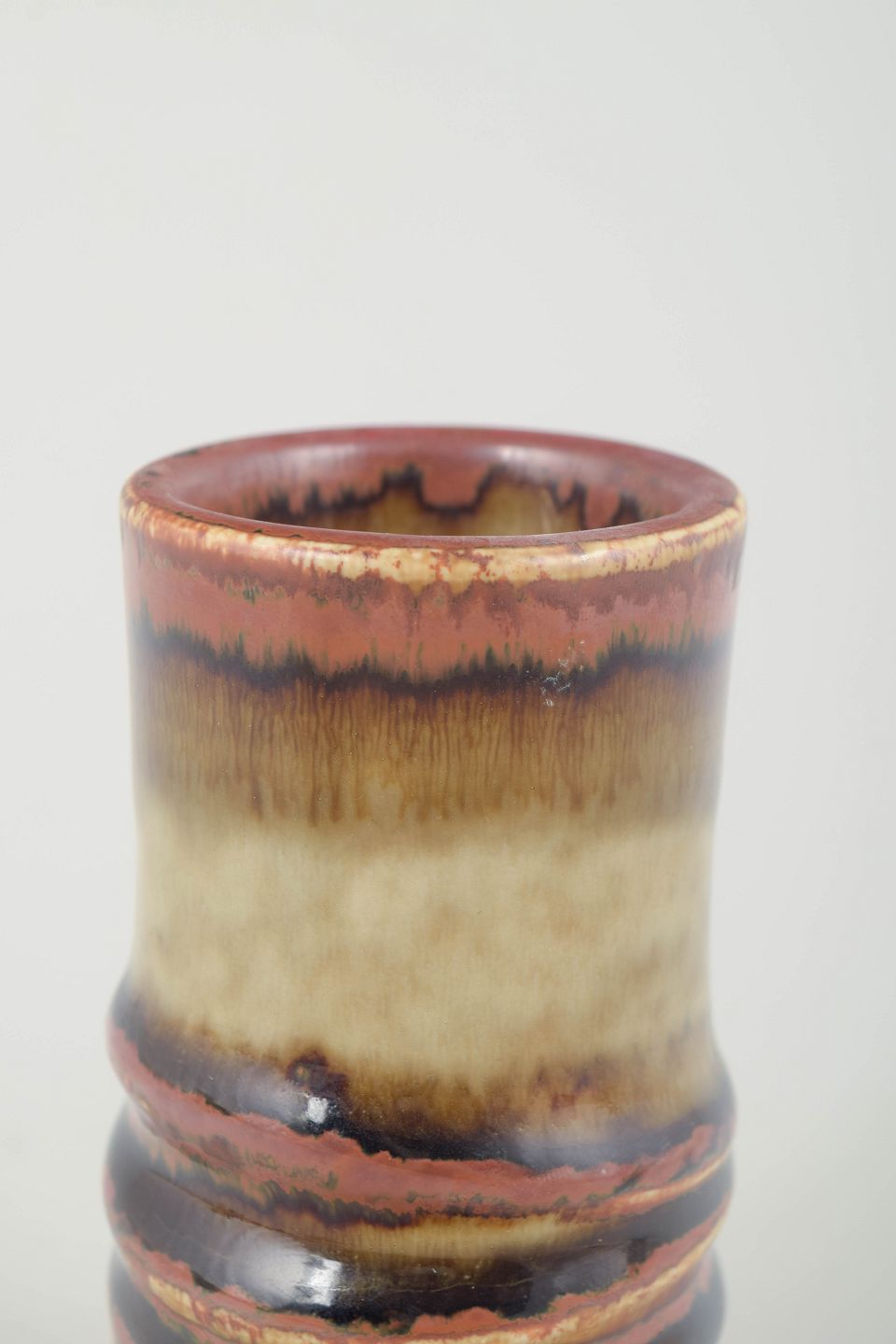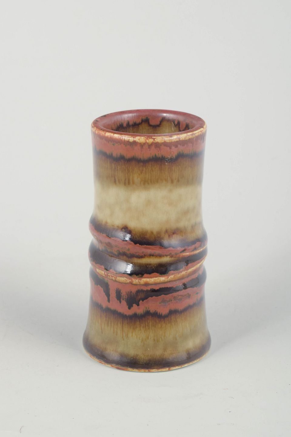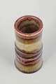 Cylindrical stoneware vase with a defined central profile and a beautifully flowing multicoloured glaze in red, brown and beige tones – a hallmark of Olle Andersson’s organic design language.