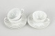 Elegant sæt bestående af tre mokkakopper med tilhørende underkopper i hvidt porcelæn, dekoreret med diskret bladornamentik udført i transparente, let grønligt tonede glasurfelter. Det lette og raffinerede udtryk samt de bløde, harmoniske former er karakteristisk for Friedl Holzer-Kjellbergs sene porcelænsdesign for Arabia.