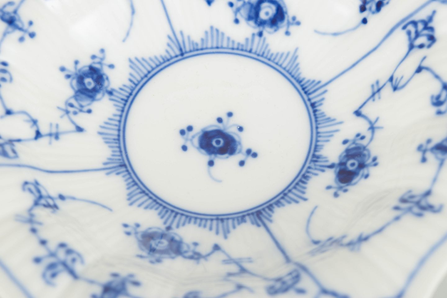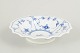 Klassisk asiet i Musselmalet Riflet, udført i riflet form med let bølget kant og dekoreret med håndmalet koboltblå underglasur. Asietten har et centralt spejl omgivet af den karakteristiske musselmalede dekoration og fremstår som en elegant mindre del til servering af kage, dessert eller tilbehør.