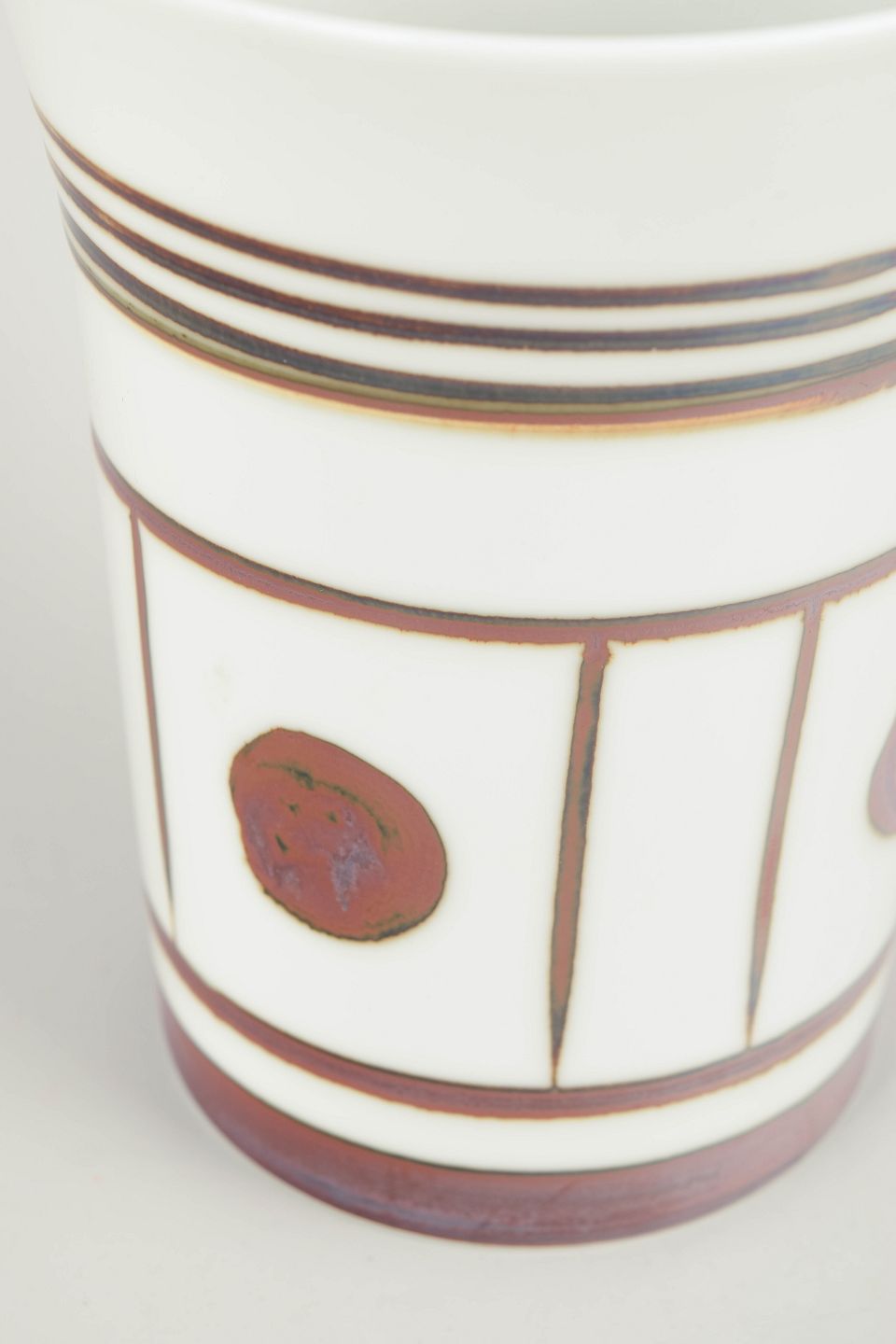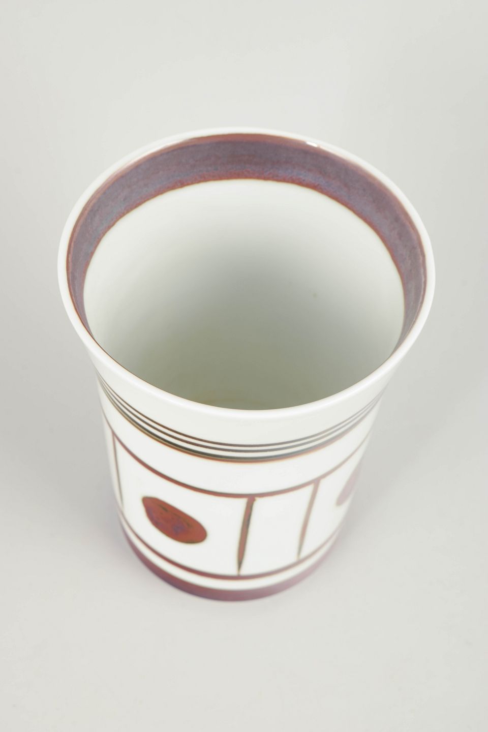 Cylinderformet vase i fajance med hvid glasur og grafisk dekoration i brunlige og violette toner. Dekoren består af bånd, linjer og cirkulære felter, typisk for serien Trude, der afspejler 1970’ernes enkle, modernistiske formsprog.