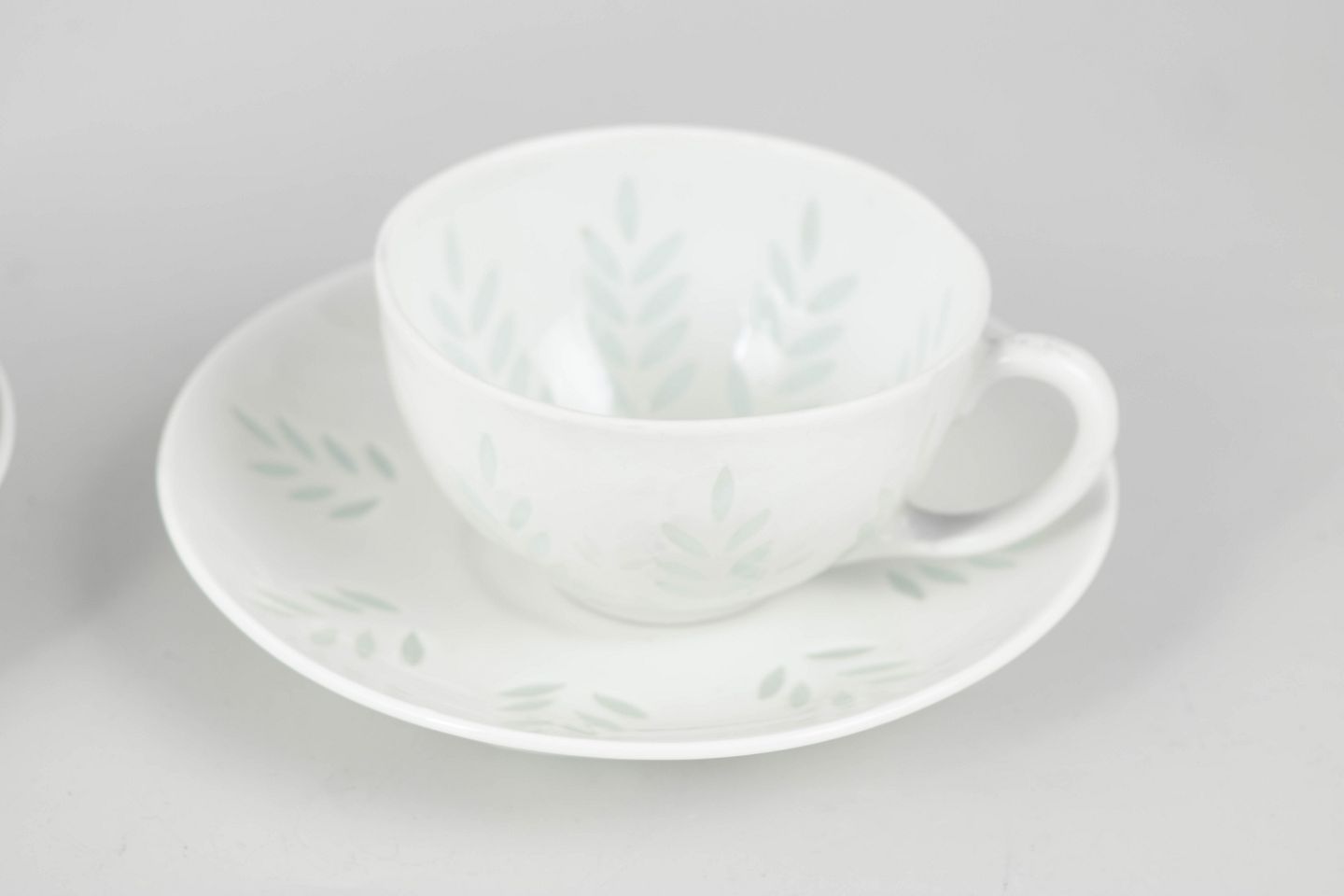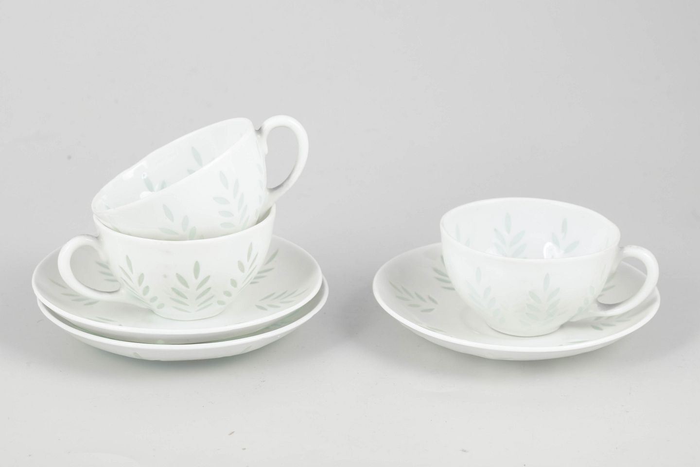 Elegant sæt bestående af tre mokkakopper med tilhørende underkopper i hvidt porcelæn, dekoreret med diskret bladornamentik udført i transparente, let grønligt tonede glasurfelter. Det lette og raffinerede udtryk kombineret med de bløde former er karakteristisk for Friedl Holzer-Kjellbergs sene porcelænsproduktion for Arabia.